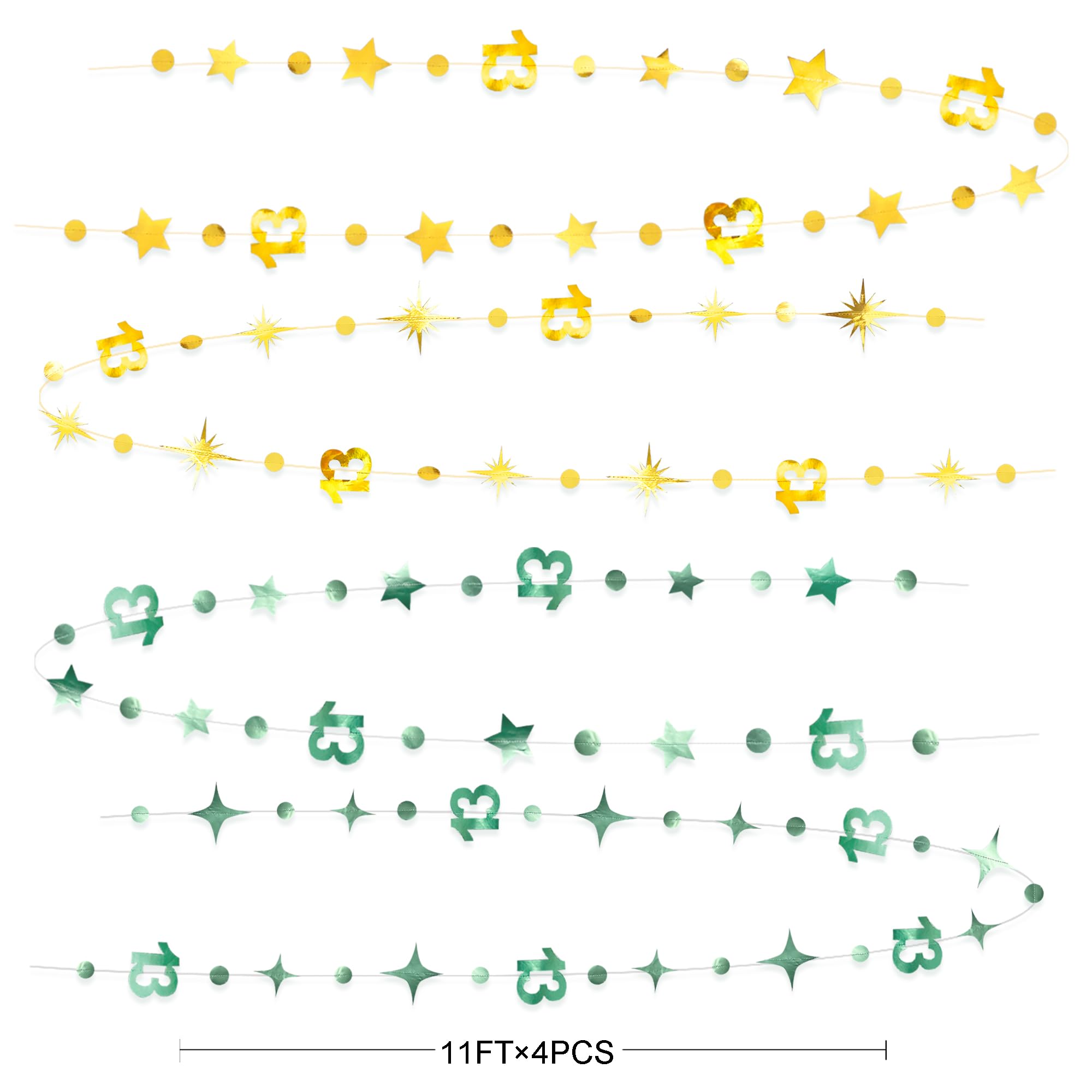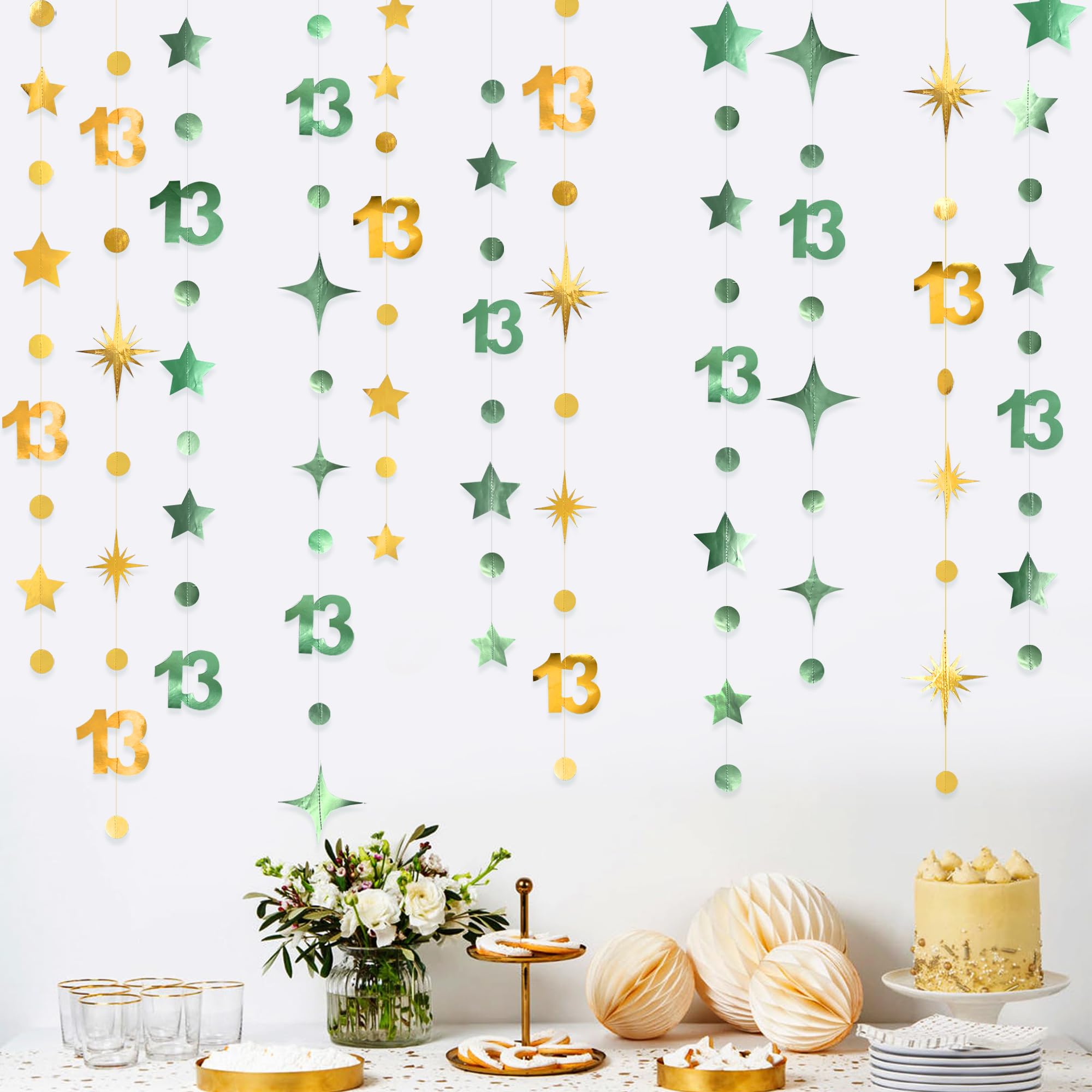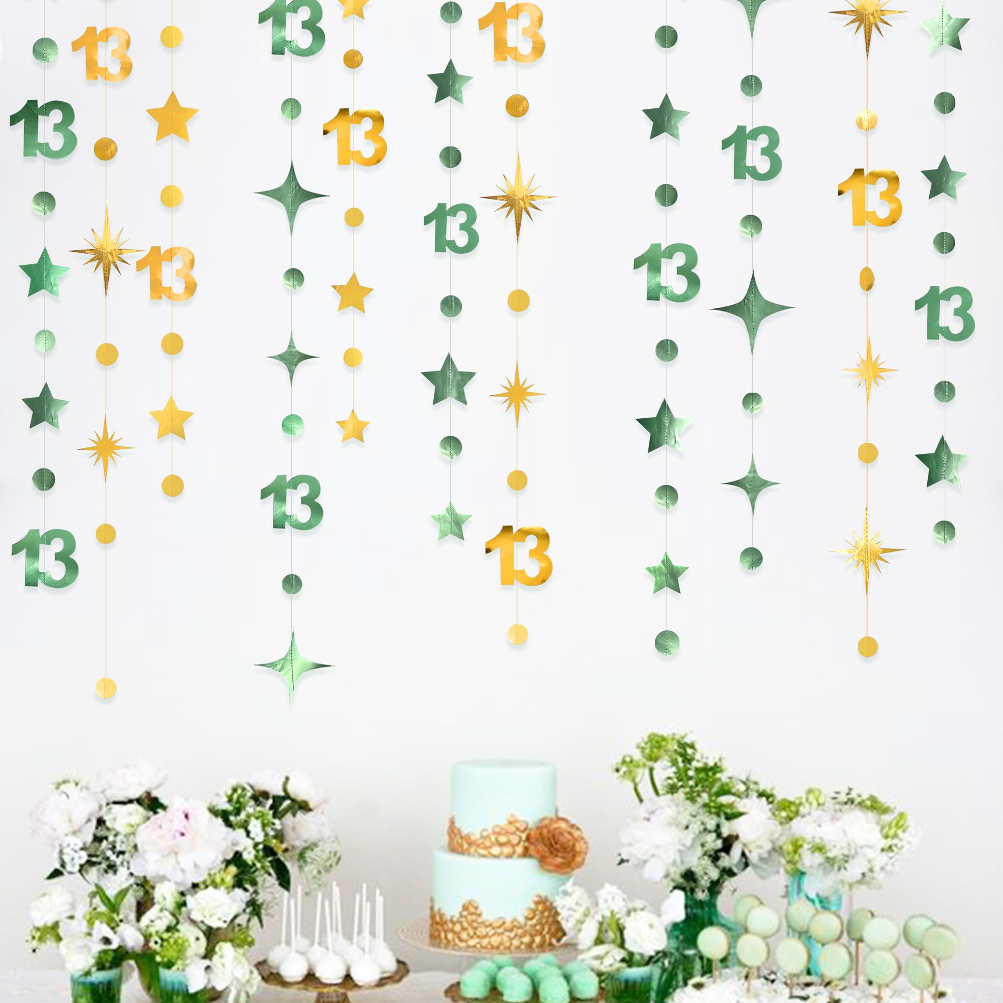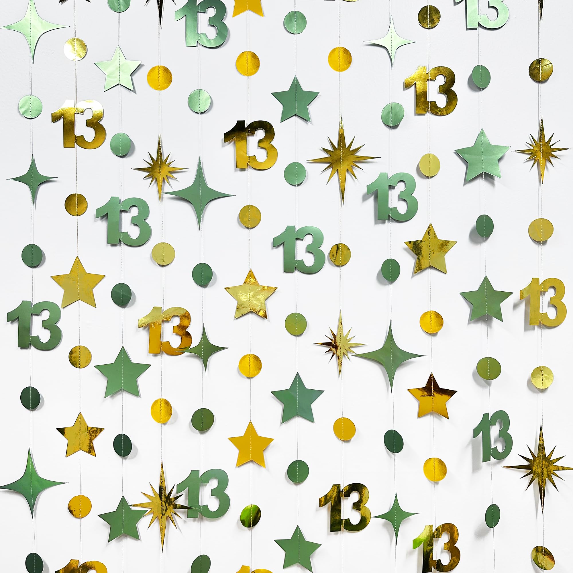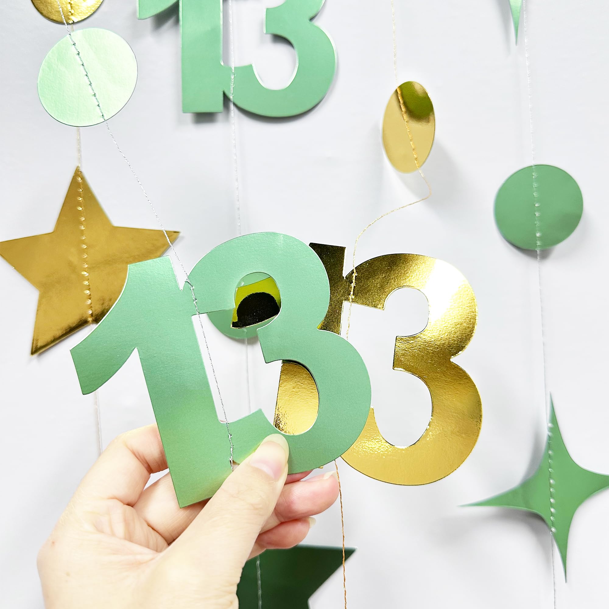👍 Package includes - 4 strings of 11.5 feet/3.5 meters sage green gold number 13 sparkling twinkle star and circle dots garlands , totally is 46 feet/14 meters