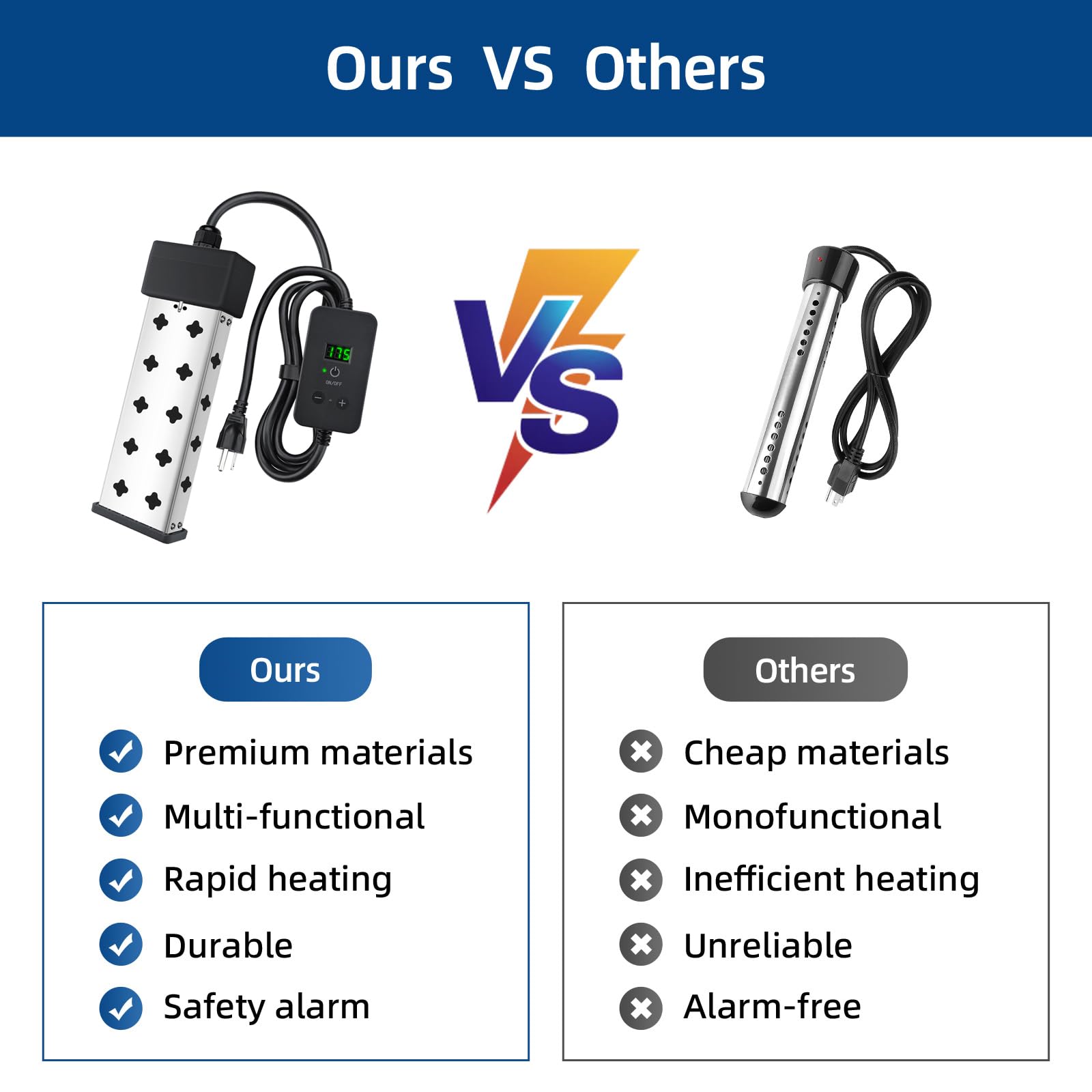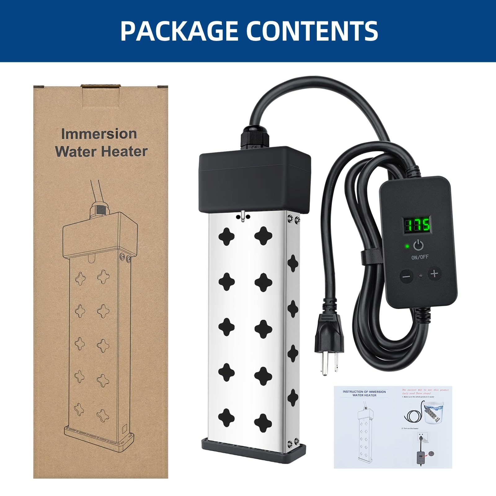 Built for safety. Auto shutoff and dry burn prevention cut power when water is low or the target is reached. A heavy duty 14-gauge power cord adds durability. Keep the controller dry and above the water line. This immersion water heater is tested for reliable daily use