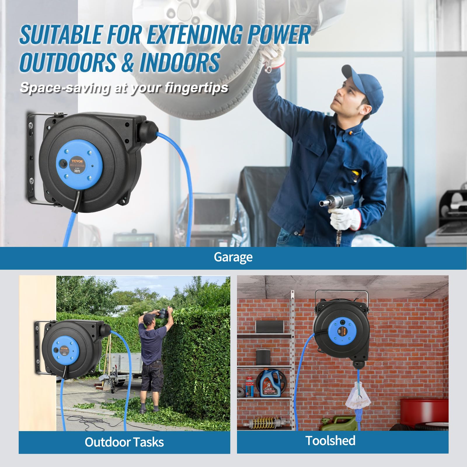 Versatile and User-Friendly: Perfect for ceiling or wall mounting, our retractable cord reel lets you easily pull and retract the cord from any direction, freeing up valuable space. Say goodbye to tangled cables and tripping hazards—our extension cord reel keeps everything neatly stored and within reach, making your setup cleaner and more efficient.
