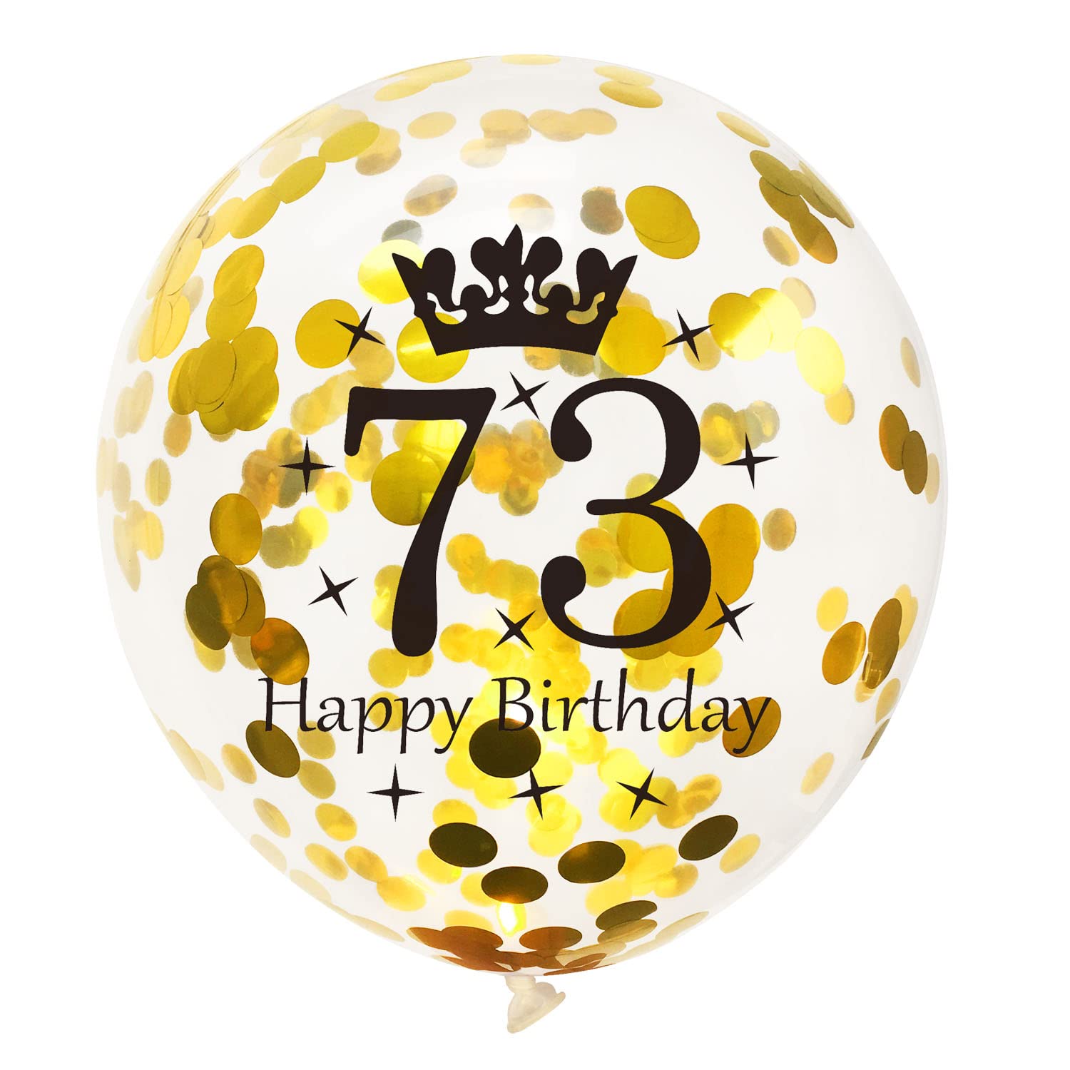 Package:5 pieces 12 inch black latex balloon printed with the words "73 Happy Birthday",5 pieces 12 inch gold latex balloon printed with the words"73 Happy Birthday",5 piece 12 inch gold confetti balloons printed with the words"73 Happy Birthday", very suitable for women men 73rd birthday party decorations