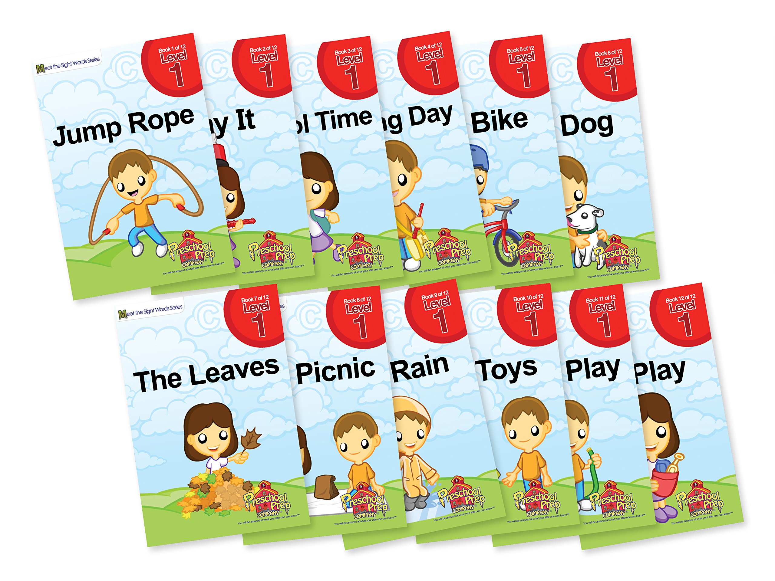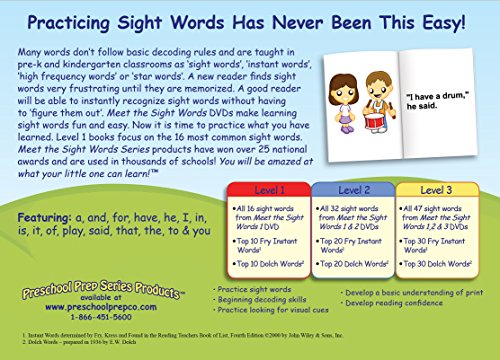 Practicing Sight Words Has Never Been This Easy! Many words don t follow basic decoding rules and are taught in pre-k and kindergarten classrooms as sight words, instant words, high frequency words or star words. A new reader finds sight words very frustrating until they are memorized. A good reader will be able to instantly recognize sight words without having to figure them out. Meet the Sight Words DVDs make practicing sight words fun and easy. Now it is time to practice what you have learned. Level 1 books focus on the 16 most common sigh words. Each of the 12 easy reader books in the boxed set includes the 16 most frequent kindergarten sight words. The pages consist mostly of sight words. The majority of non-sight words in these books are easy to decode or have a visual cue in the illustration.Meet the Sight Words Series products have won over 25 national awards and are used in thousands of schools! You will be amazed at what your little one can learn! Featuring: a, and, for, have, he, I, in, is, it, of, play, said, that, the, to & you Sturdy cardboard boxed set with handle for children on the go. Preschool Prep Company DVDs include: Meet the Letters, Meet the Numbers, Meet the Shapes, Meet the Colors, Meet the Sight Words 1, Meet the Sight Words 2, Meet the Sight Words 3,