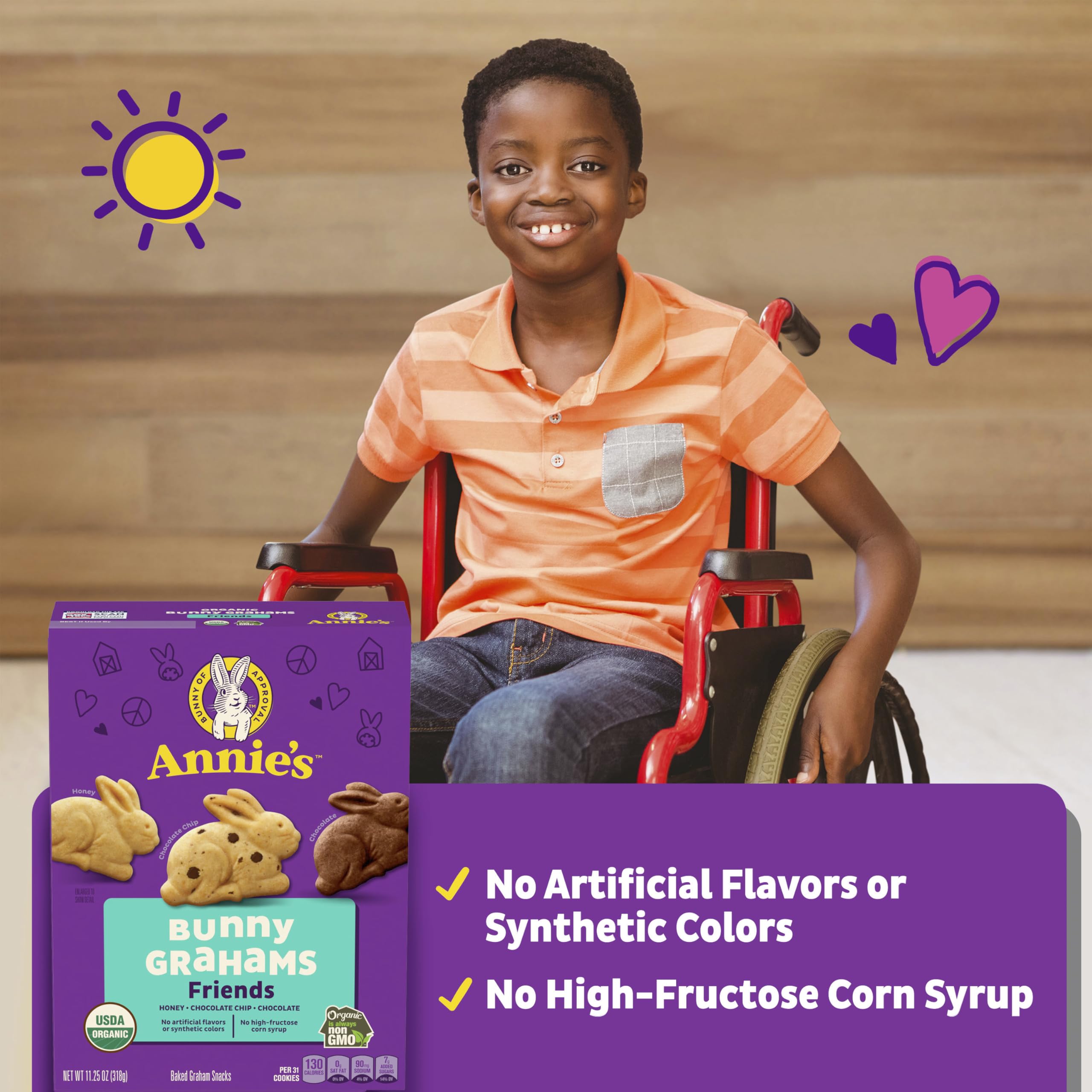 Kids will love the crunchy, munchy taste of Annie's Organic Friends Bunny Grahams Baked Graham Snacks. Enjoy three tasty flavors in one box: chocolate, honey, and chocolate chip. These bunny-shaped graham cracker snacks for kids are great for snacking and sharing among friends. Hop along to stock your pantry with these non-GMO and certified USDA Organic bunny grahams to make everybunny smile. Sprinkle some joy and hoppiness into your family's day with these organic snacks made with no high fructose corn syrup and no artificial flavors or synthetic colors. Annie's makes products in over 20 family-friendly categories, from fruit flavored snacks and cereal to mac and cheese. For busy bunnies and families on the go, we help make life a little easier and more delicious by spreading goodness through tasty foods and kindness to the planet.