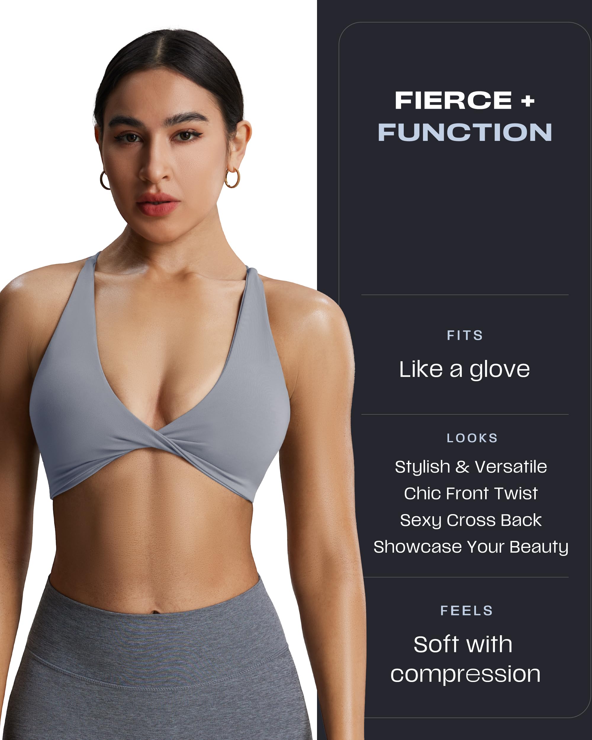The Sienna twist womens sports bra featuring thin crossed back straps and padding, despite small straps, it doesn’t bite into your traps and cause neck pain