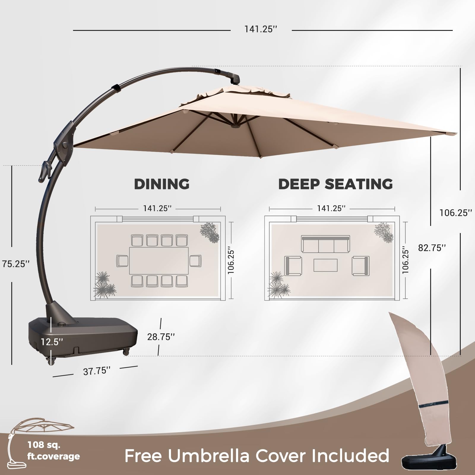 COVER A LARGE AREA: This cantilever umbrella provides 108 square feet of relaxing cooling shade. The innovative auto-lock system lets you easily adjust the tilt to stay shaded as the sun moves. The package also comes with a protective cover for the outdoor umbrella
