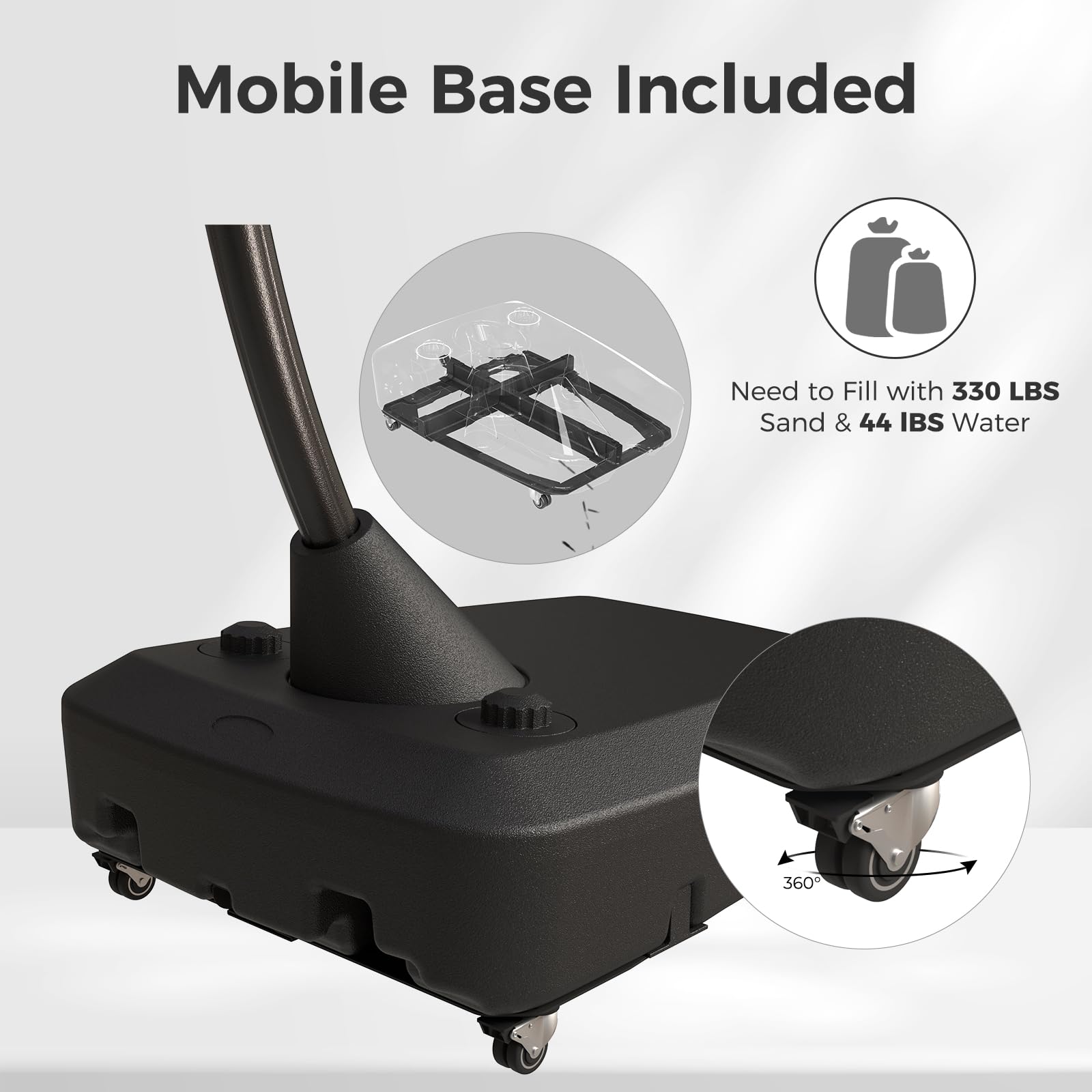 STABILITY BASE WITH WHEELS: The umbrella has wheels for easy movement. To ensure stability, fill the base with 330 lbs of sand and 44 lbs of water (374 lbs total). For safety in bad weather, close the umbrella into the deadlock position when not in use