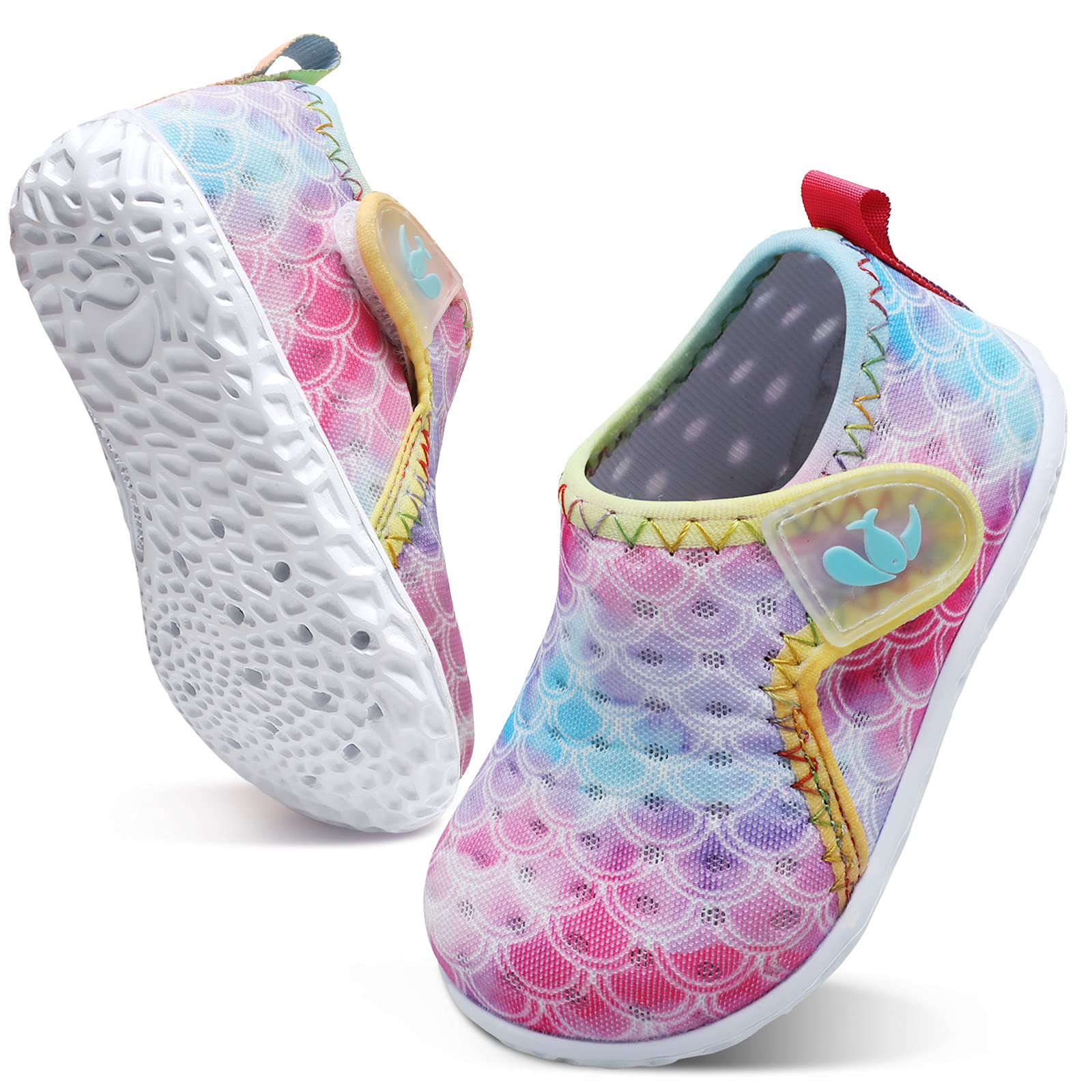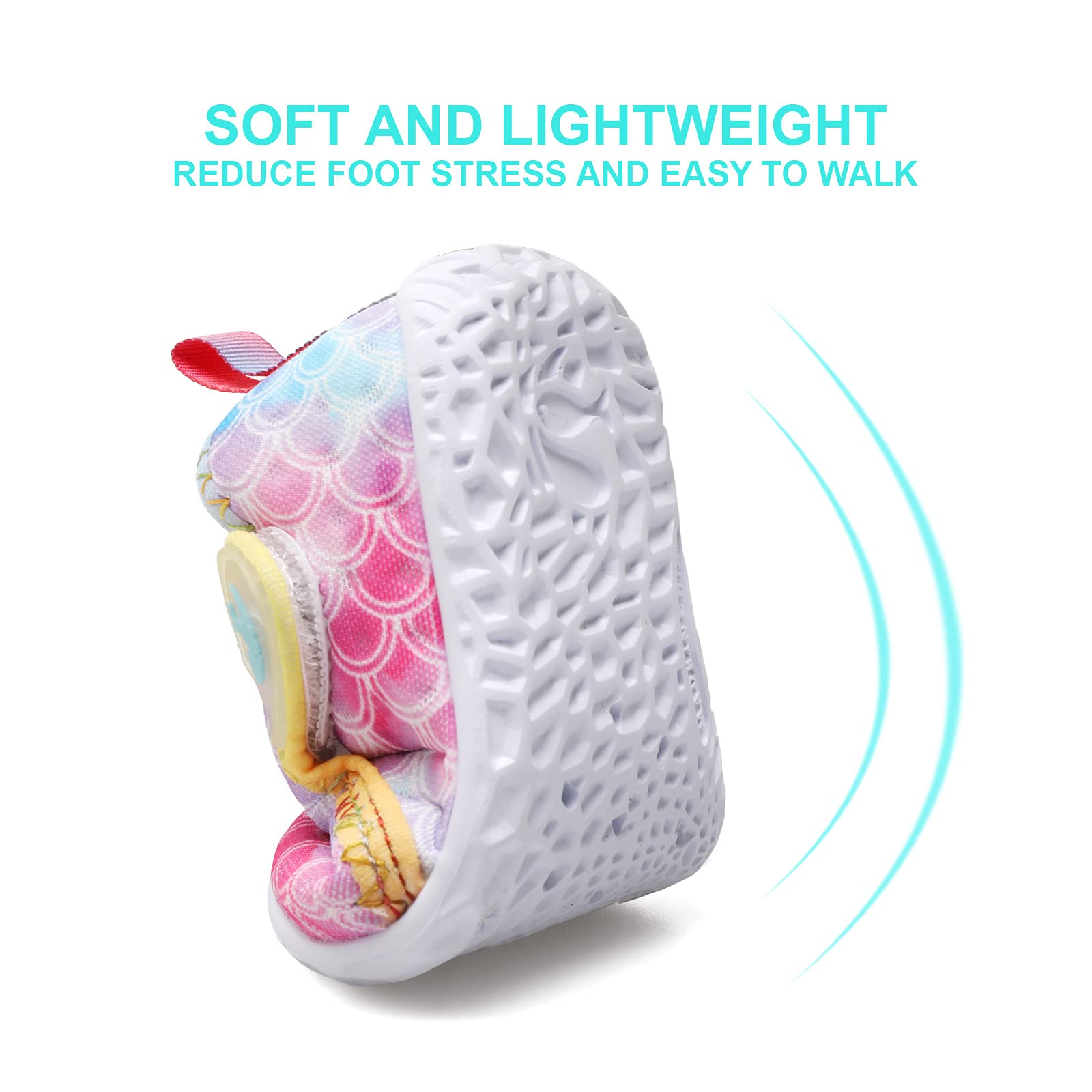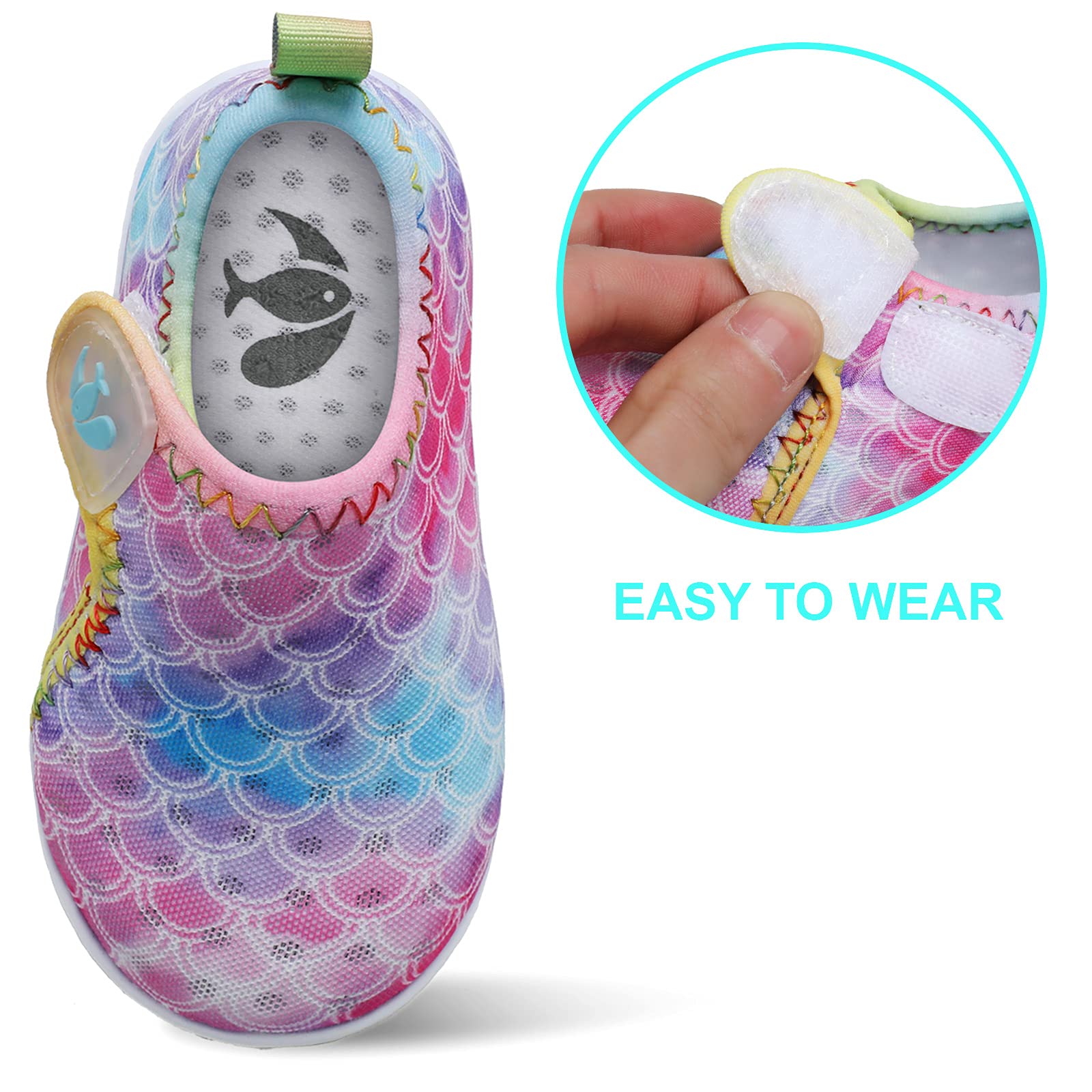 SLIP ON & HOOK AND LOOP: The smooth neck design reduce abrasions when babies wear aqua socks. It also features hook and loop design that make babies easy to put on and take off.
