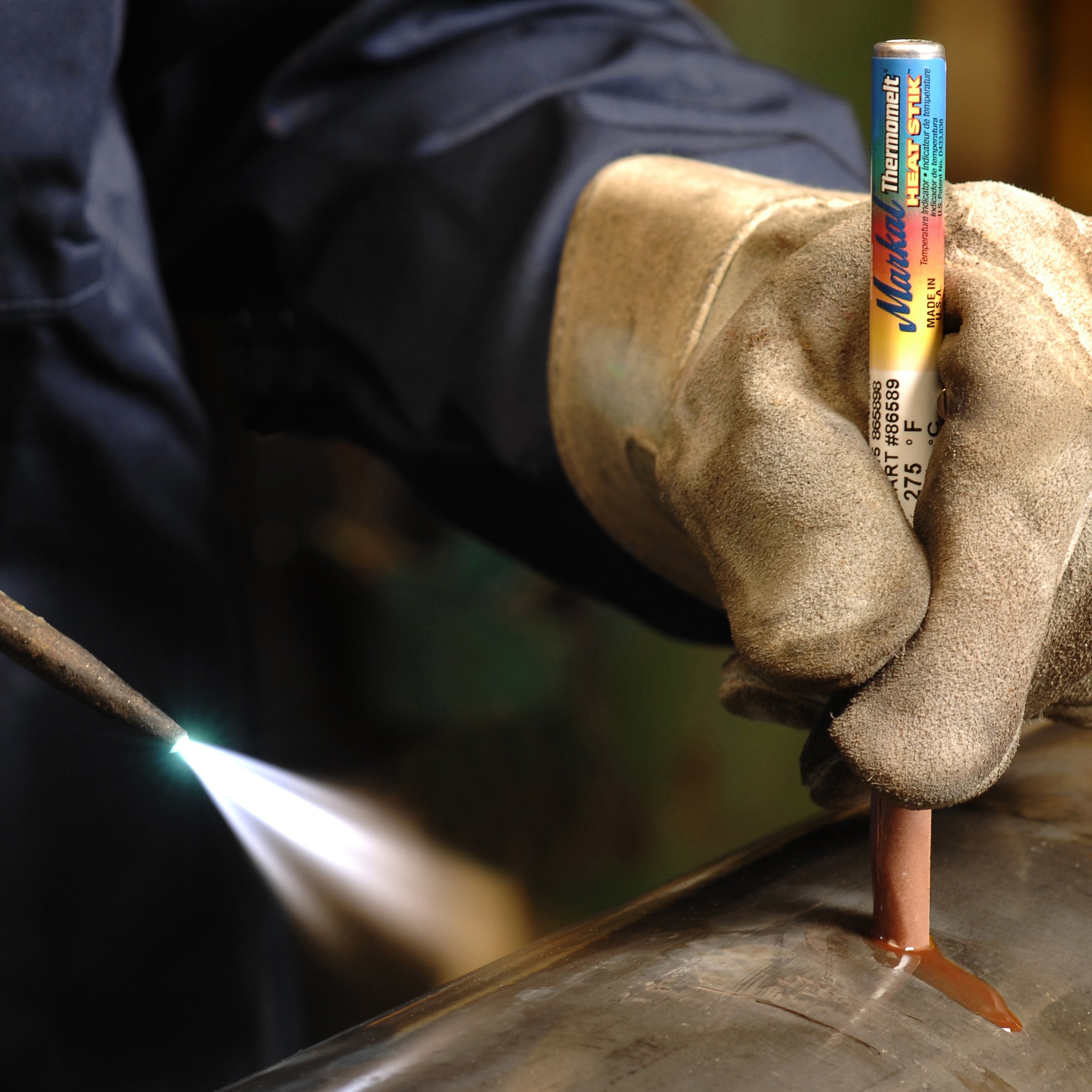 Thermomelt when temperature measurement is critical. The Markal Thermomelt temperature indicator with superior break-resistance is the industry’s largest, longest-lasting stick, improving efficiency and uptime. New Certified Thermomelt Heat Stiks are specifically analyzed and certified to contain low concentrations of halogens, sulfur and low melting point metals (less than 250 ppm). Ideal for use in nuclear power generation facilities such as shipbuilding, atomic energy or anywhere that nuclear certification is required. 33 Percent bigger and stronger; same proven reliability. Bigger, break-resistant stick cuts down on replacement costs. Improved holder features a durable metal shaft and convenient pocket clip. Gravity advance holder protects stick and prevents it from slipping back inside. Meets ANSI/ASME Code B32.1 and B31.3, AWS D1.1 and ASME Code Sec. I, III and VII, NIST traceable. Typical application includes: ship building, pressure vessels, boiler systems, bridge construction, power piping systems. Made in the USA.