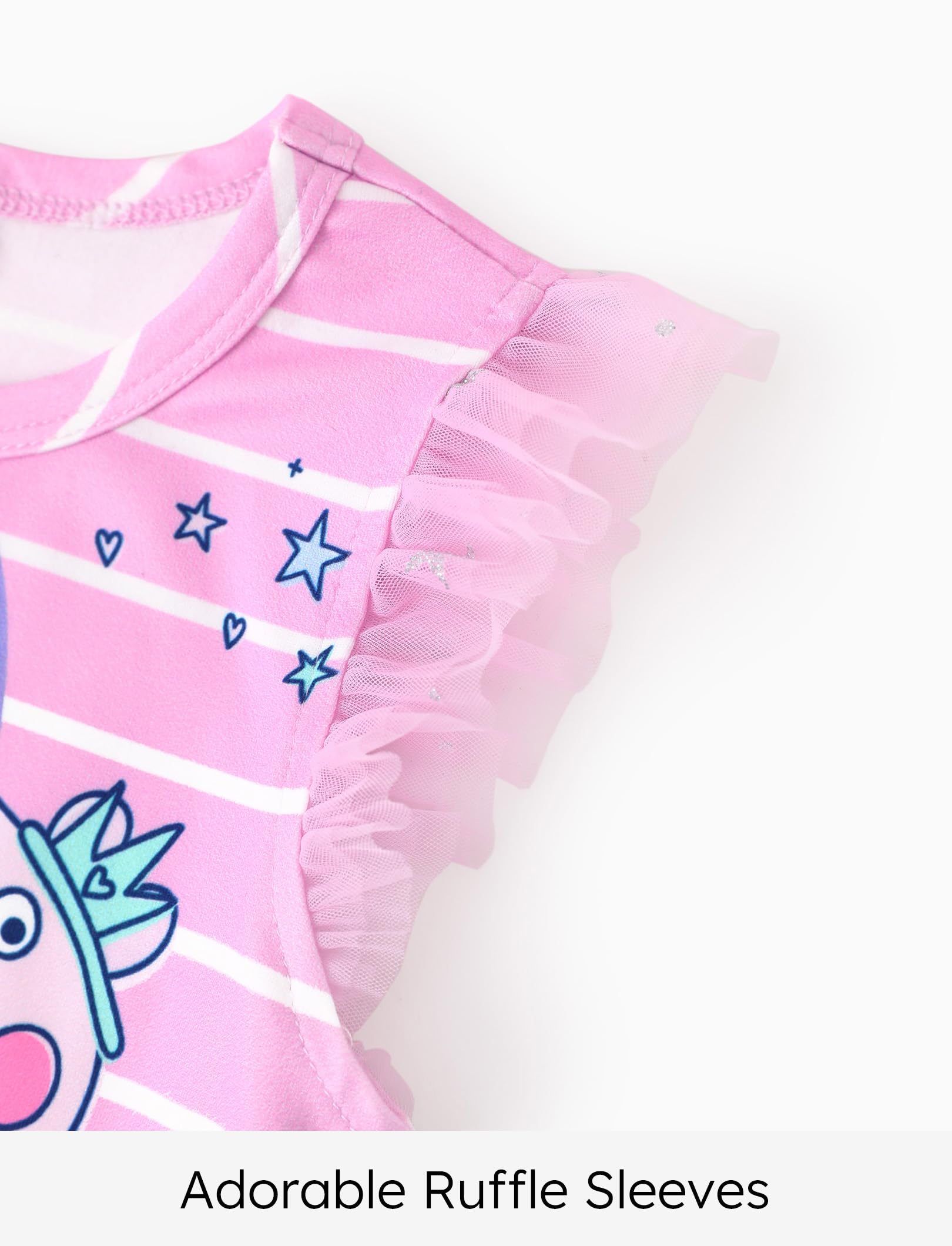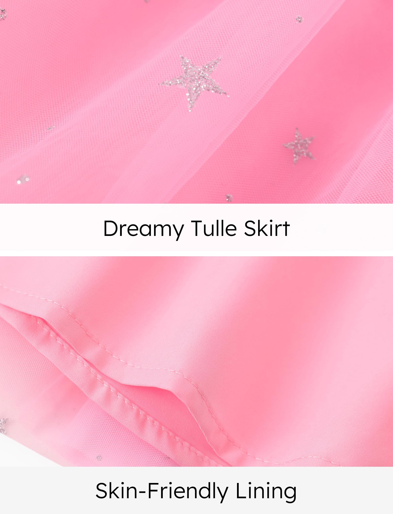 T-shirt + gauze skirt set version, shoulders with gauze flanged sleeve design, belt is blingbling rubber; The blouse is made of 220G milk silk fabric with IP pattern printing, and the skirt is colorful love net yarn + lining fabric design, which is sweet and lovely.