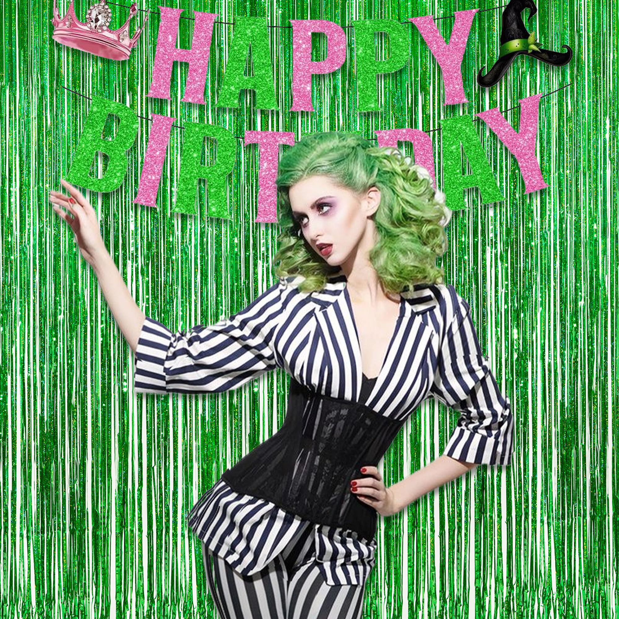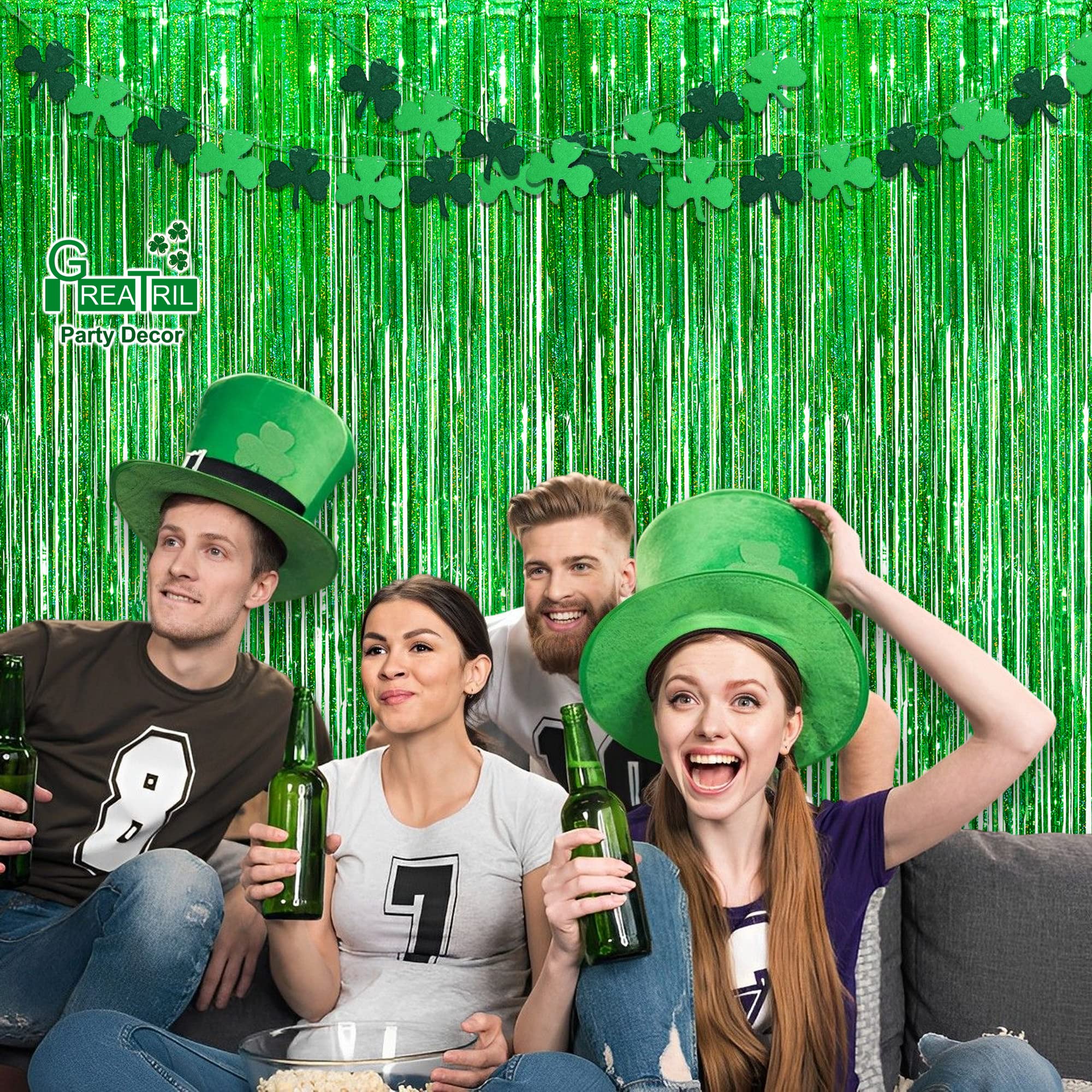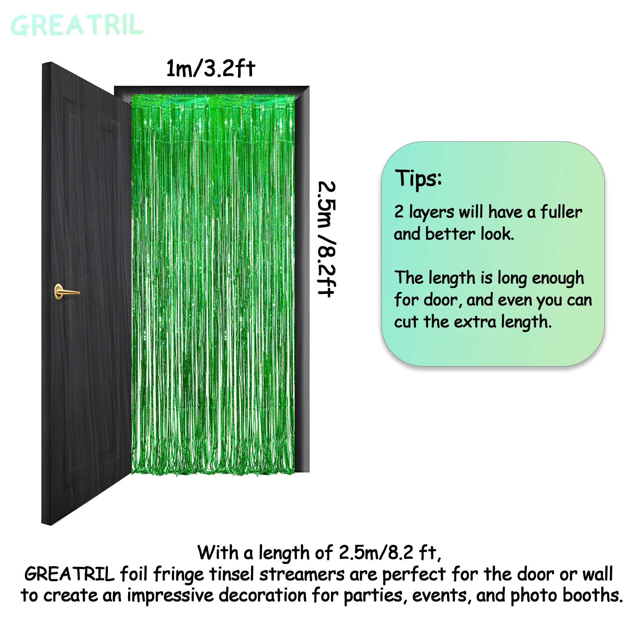 GREATRIL Brand green foil fringe curtains 2-packs, 3.2ft x 8.2ft for each pack. This green foil fringe curtain can make your party more youthful and attractive.