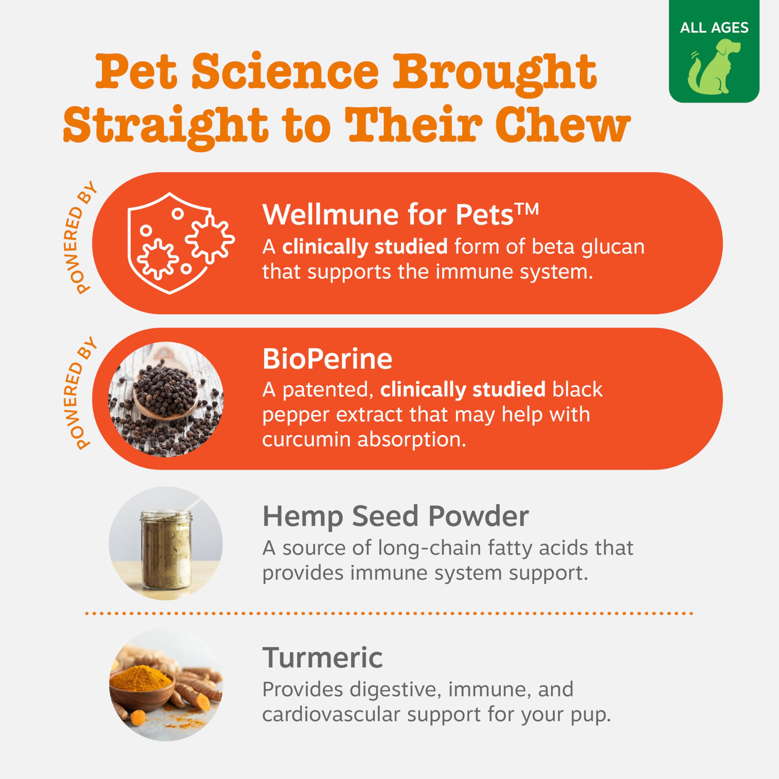 Includes Wellmune for Pets - Each chewable also features Wellmune for Pets, a clinically studied form of beta glucan that supports the immune system for your canine companion.