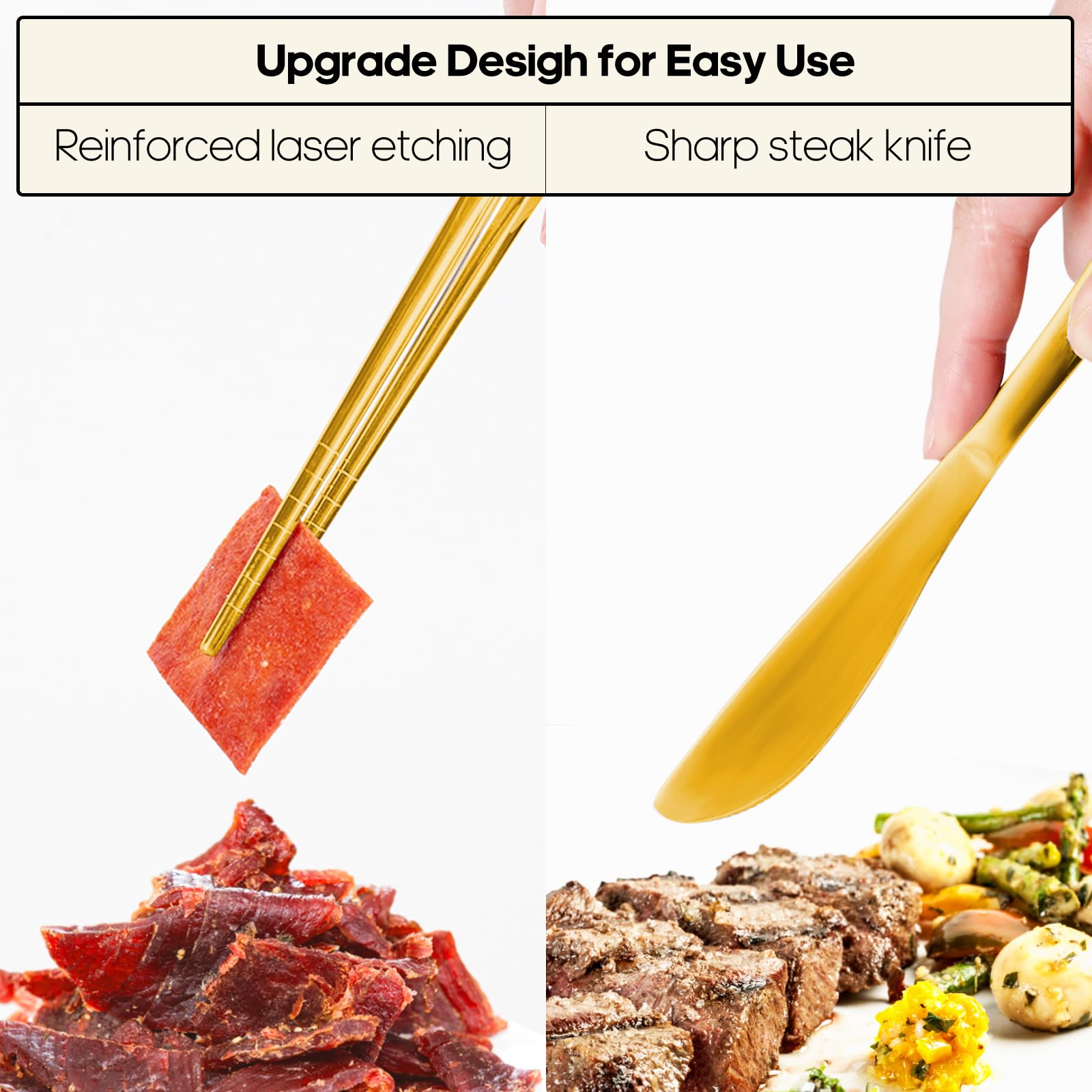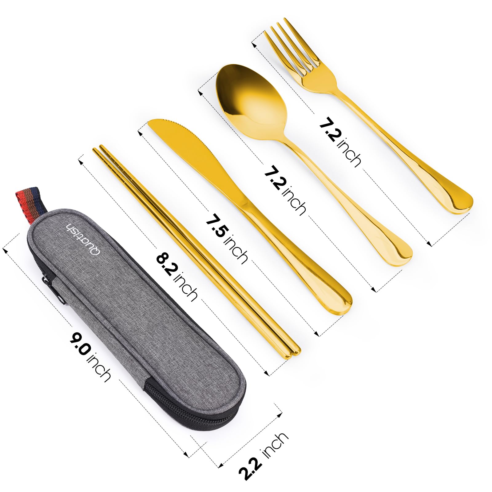 5 PCS Utensils Set: The minimalist set comes with an adult-sized fork, spoon, knife, chopsticks, and carrying case. The chopsticks are desighed with reinforced laser etching, for better anti-slip and grab the food