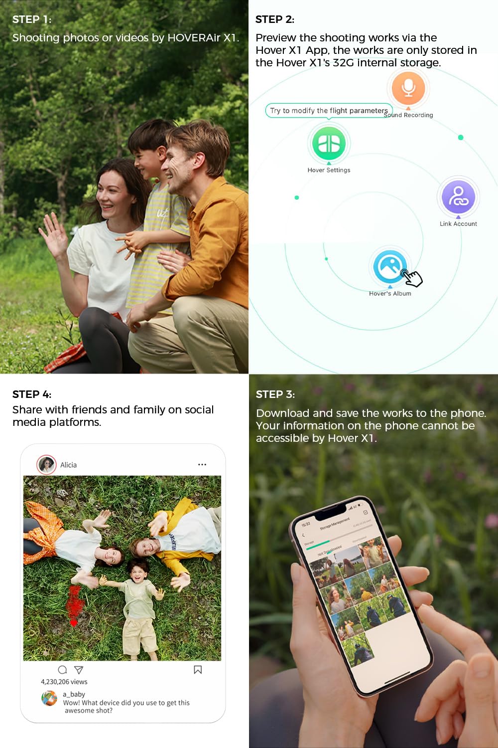 Perfect for Content Creation and Sharing: Experience the joy of hands-free Perfect for Content Creation and Sharing: Experience the joy of hands-free shooting and download your photos and videos via the Hover X1 App after your flight. With a simple click, instantly share your memorable moments with friends and family on your favorite social media platforms such as Instagram and Facebook. HOVERAir X1 is a perfect ally for vloggers, hikers, bikers, and other adventurers.