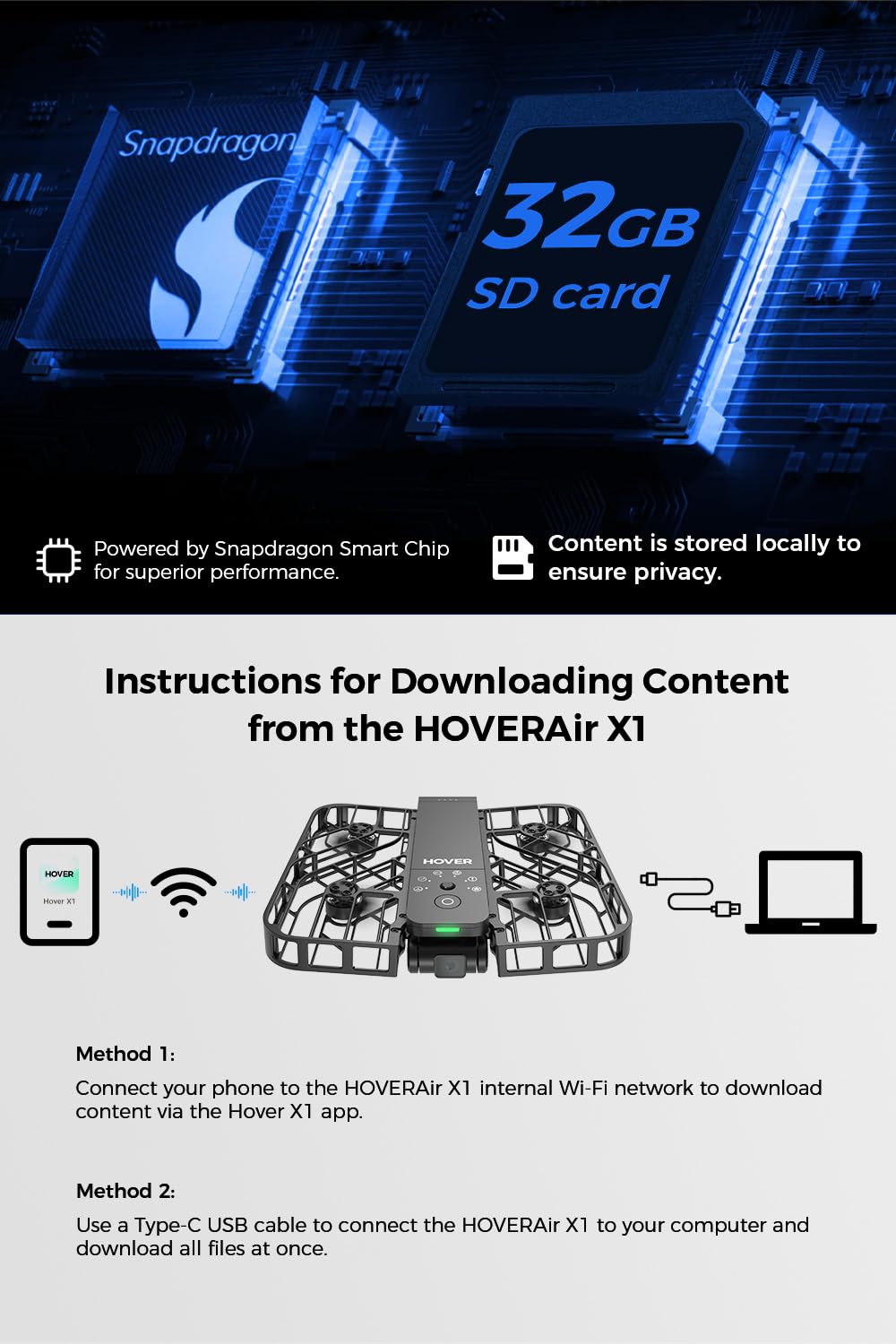 Privacy Shield with Internal Storage: Boasting 32GB of internal storage, bid farewell to the hassle of SD cards while securing your privacy with locally stored content. Easily download your creations using the Hover X1 App or by connecting the drone to your computer. Your moments, your control!