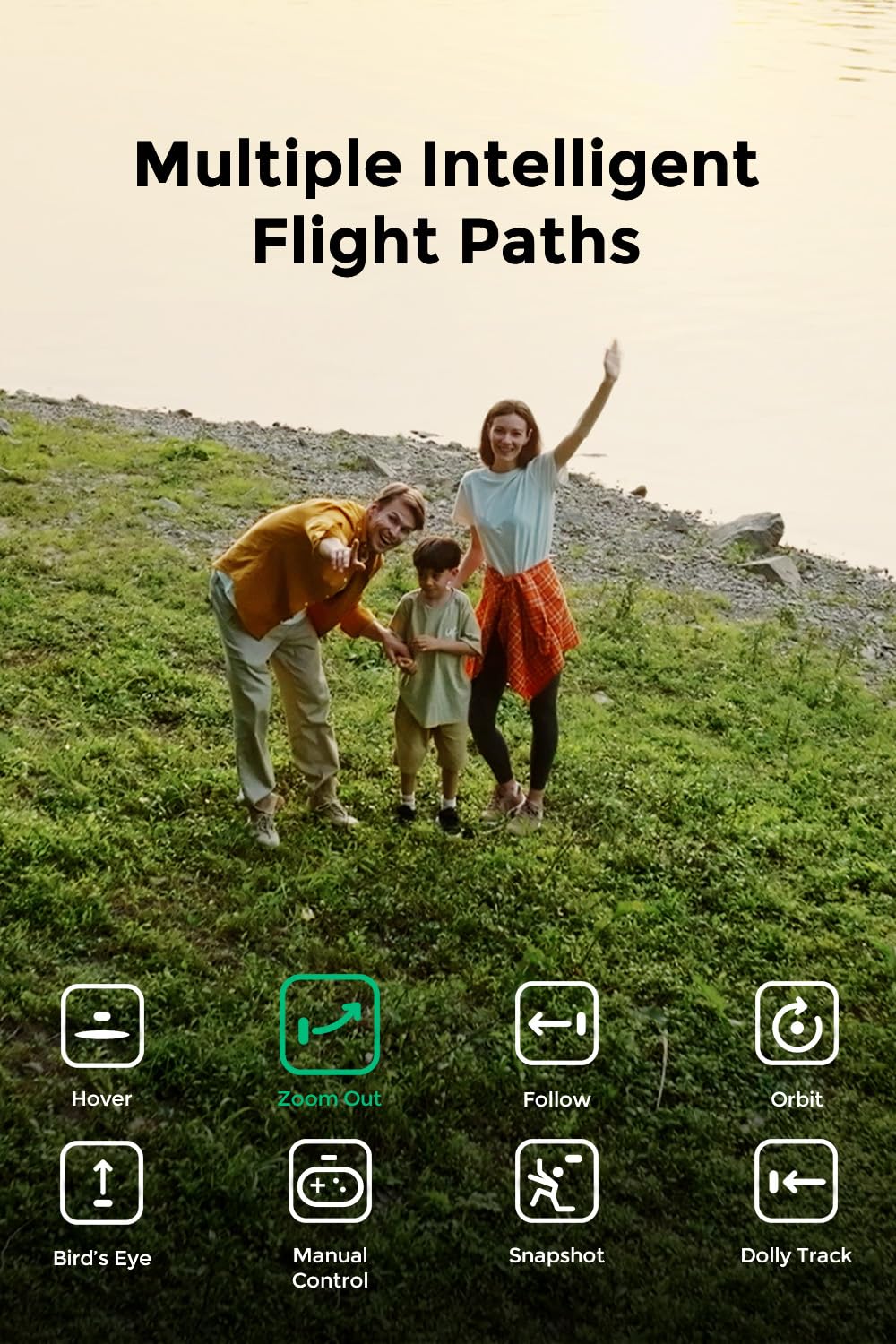 Automatic and Intelligent Flight Paths: Experience hands-free flying with the pre-programmed flight paths, including Hover, Follow, Zoom Out, Orbit, Bird’s Eye, Manual Control, etc. Take control with Manual Control mode, tailoring your flight experience to perfection. With Each battery supporting approximately 20 intelligent flight paths(11 minutes), your 100% flight time is dedicated to creating captivating and shareable content.