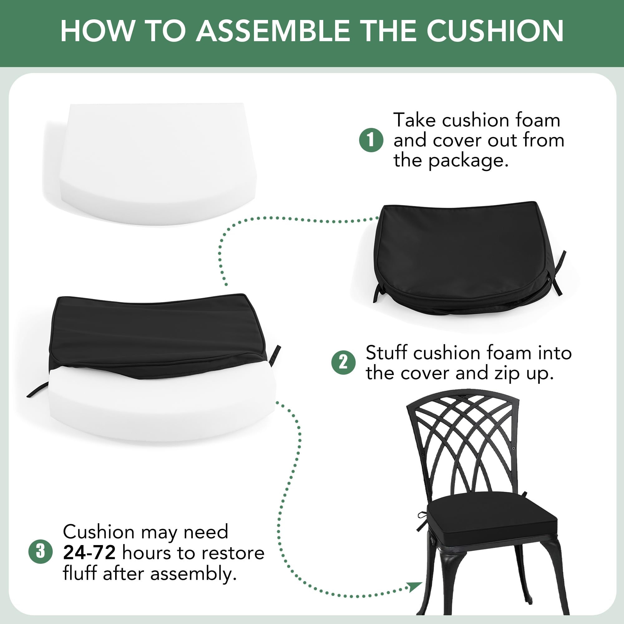 Allow Time for Expansion: Your outdoor chair pads will arrive compressed for efficient shipping. Upon unpacking, they may appear thinner or slightly misshapen. Please allow 1-3 days for full expansion and shape recovery. Gently shaking or fluffing the cushions can help speed up the process.