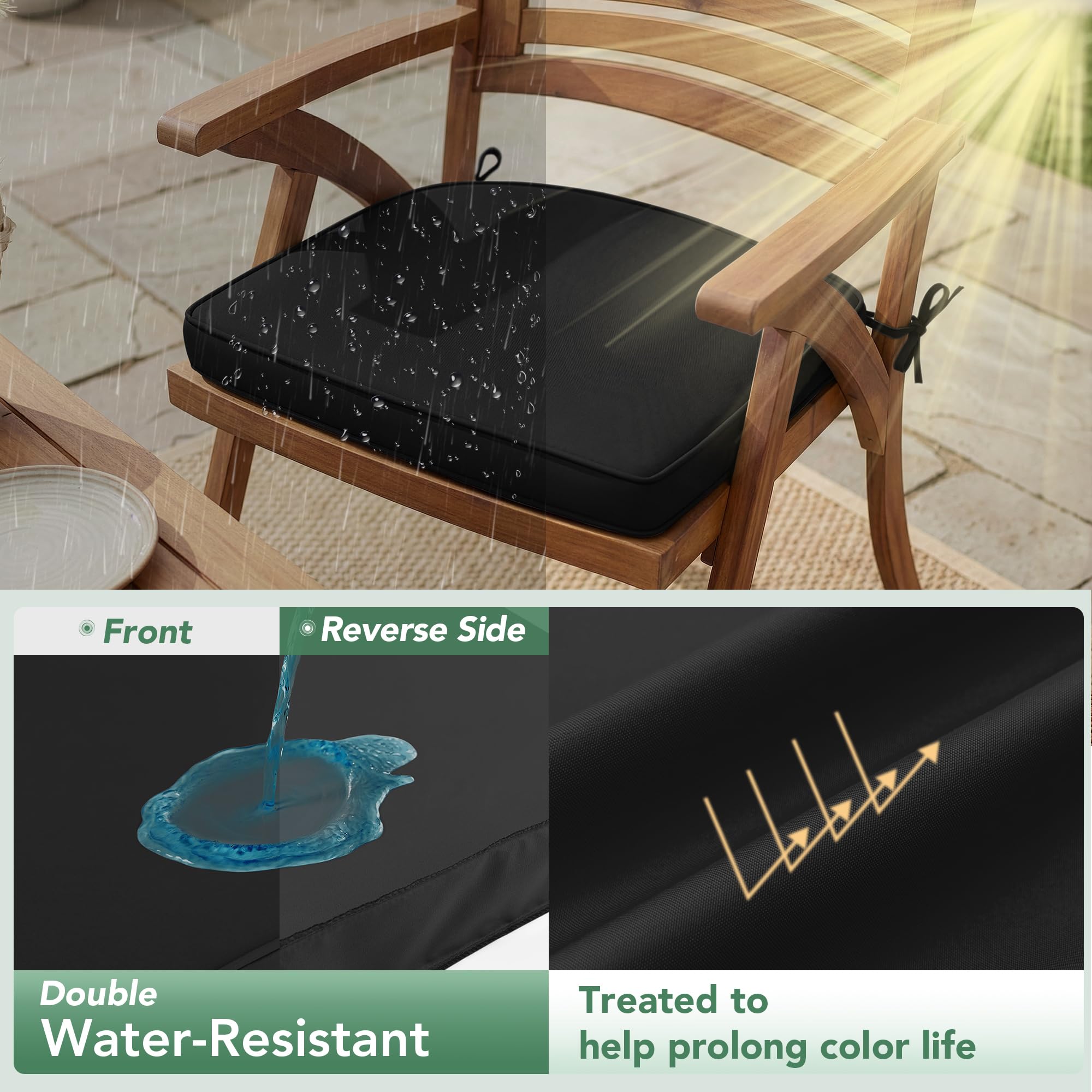 Waterproof & Fade-Resistant: Crafted from high-quality 250gsm polyester fabric, these premium patio chair cushions are built to withstand the elements. The weather-resistant fabric repels moisture, keeping your outdoor seat cushions dry and protected from rain, while anti-fading technology preserves their vibrant colors even after prolonged sun exposure.