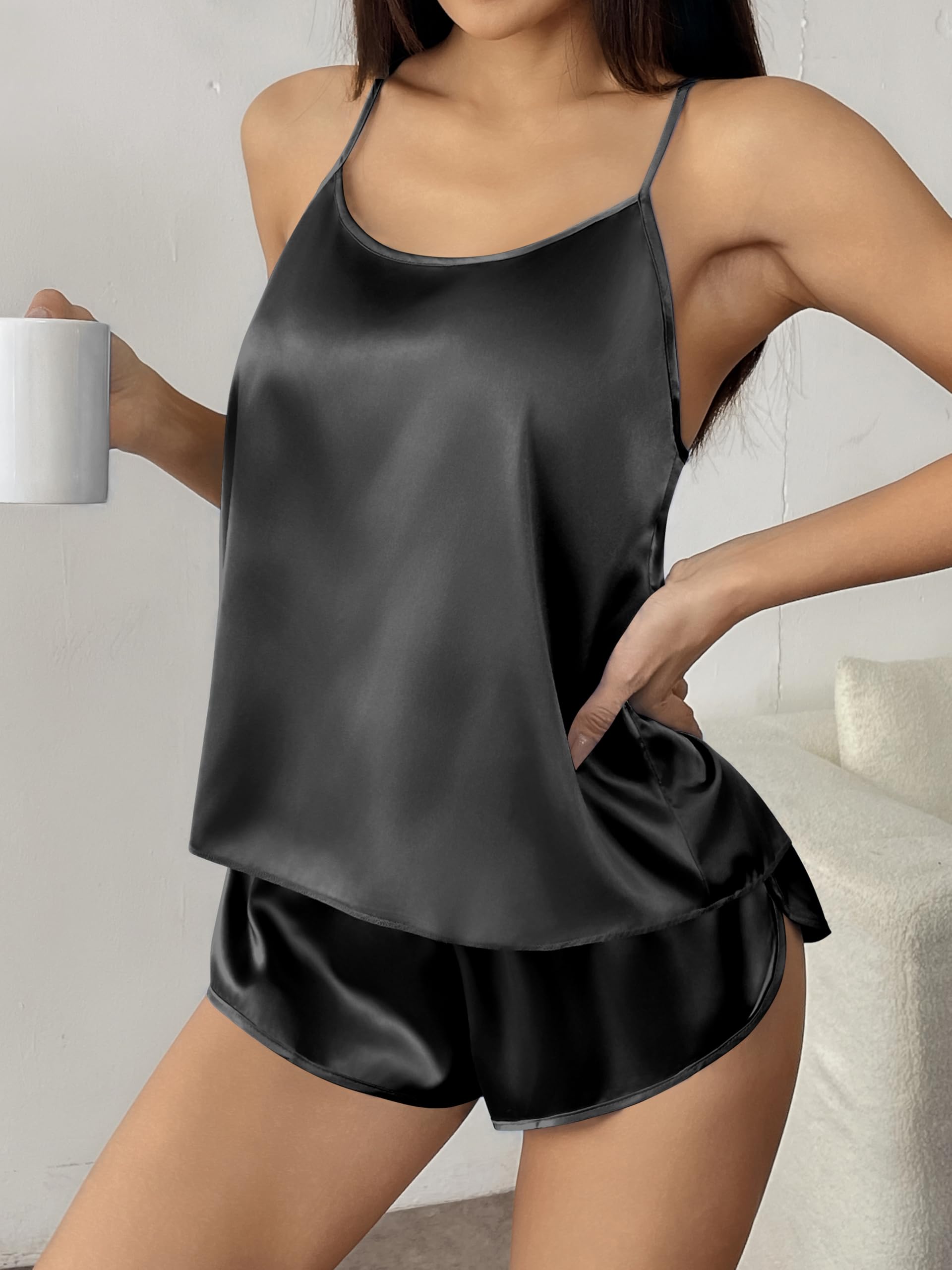 2-PIECE CAMI & SHORTS: Cute, flirty sexy satin pajamas for women—playful gothic/cute prints & solid hues; adjustable cross-back cami & side-slit shorts. Ideal for gothic gatherings/sleepovers/Halloween/bachelorette parties