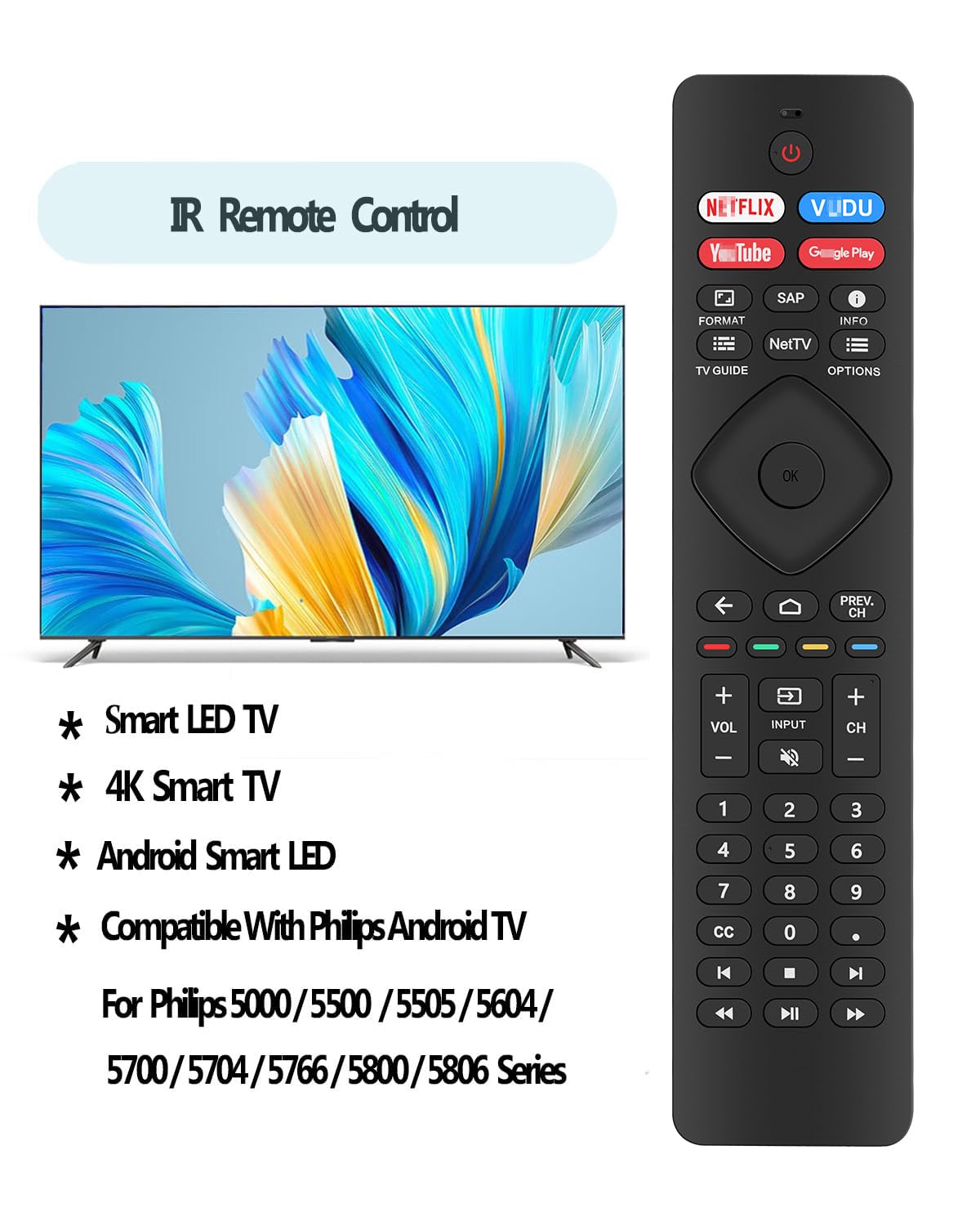 This TV remote replacement NH800UP RF402A-V14 BT800 is a versatile Philips smart tv remote control compatible with a wide range of Philips Android Smart TV models, including 5704 5604 5504 5766 5806 Series 43PFL5704 55PFL5704 50PFL5704 55PFL5604 50PFL5604 43PFL5604 75PFL5604 65PFL5504/F7 55PFL5704/F7 65PFL5504/F6 55PFL5604/F7 50PFL5704/F7 43PFL5704/F7 50PFL5604/F7 43PFL5604/F7 75PFL5604/F7 32PFL5505/F7 65PFL5604/F7 65PFL5704/F7 75PFL5704/F7 50PFL5604/F7A 55PFL5604/F7A. This is a Philips TV infrared remote control, rather than one with voice control capabilities