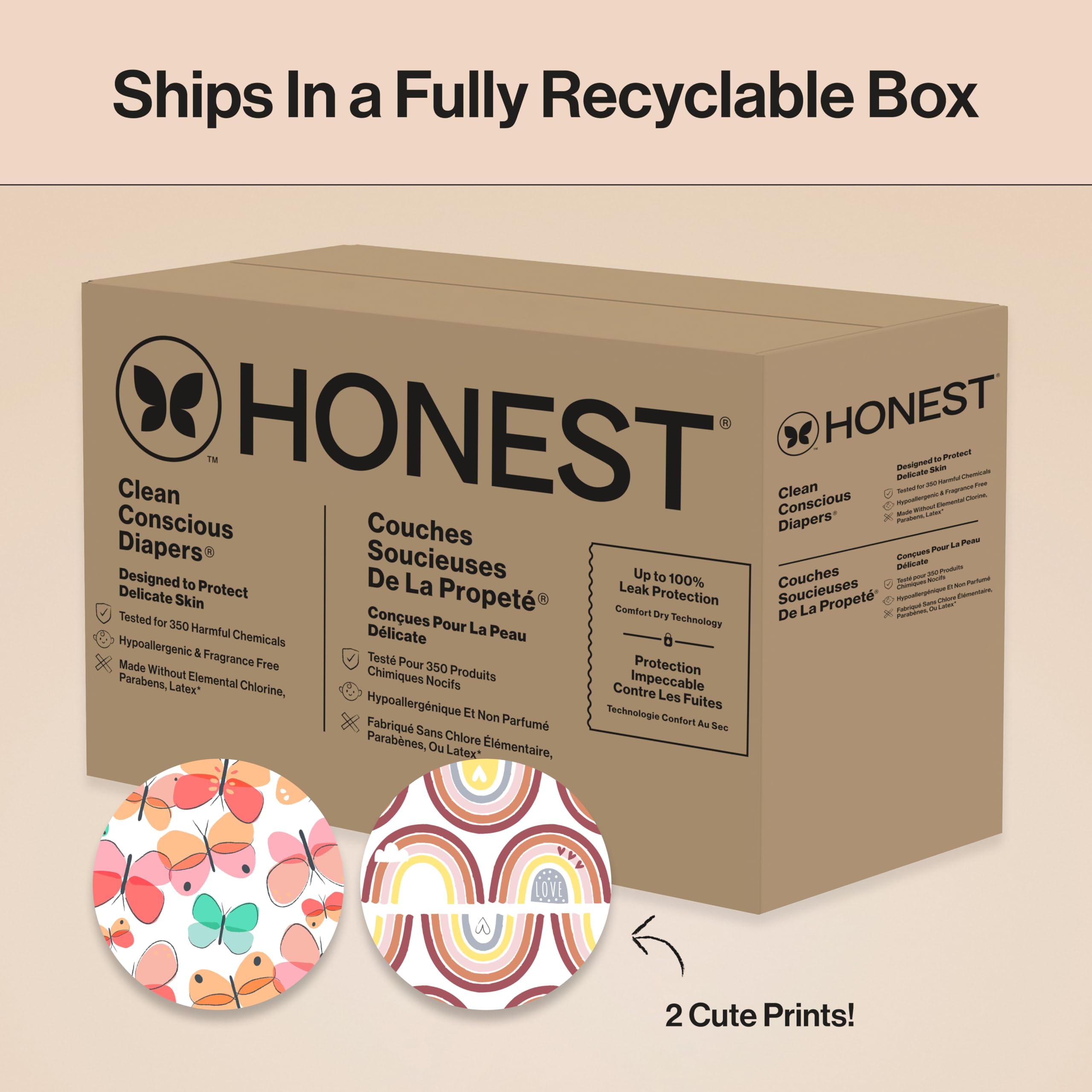 Designed to protect delicate skin, Honest Clean Conscious Diapers keep baby comfortable and dry through all the wiggles and wobbles! Our softest diaper yet delivers up to 100% leak protection with Comfort Dry Technology. The hypoallergenic, plant based inner liner, flexible stretch wings, super absorbent core, and channel technology provide a comfy, secure fit for all ages and stages. Because safety is top priority, these diapers are OEKO-TEX STANDARD 100 Certified, a 3rd party that tests for 350 harmful chemicals, and made with FSC Certified Fluff Pulp and other controlled materials. And for cuteness overload, each diaper features a super cute print!