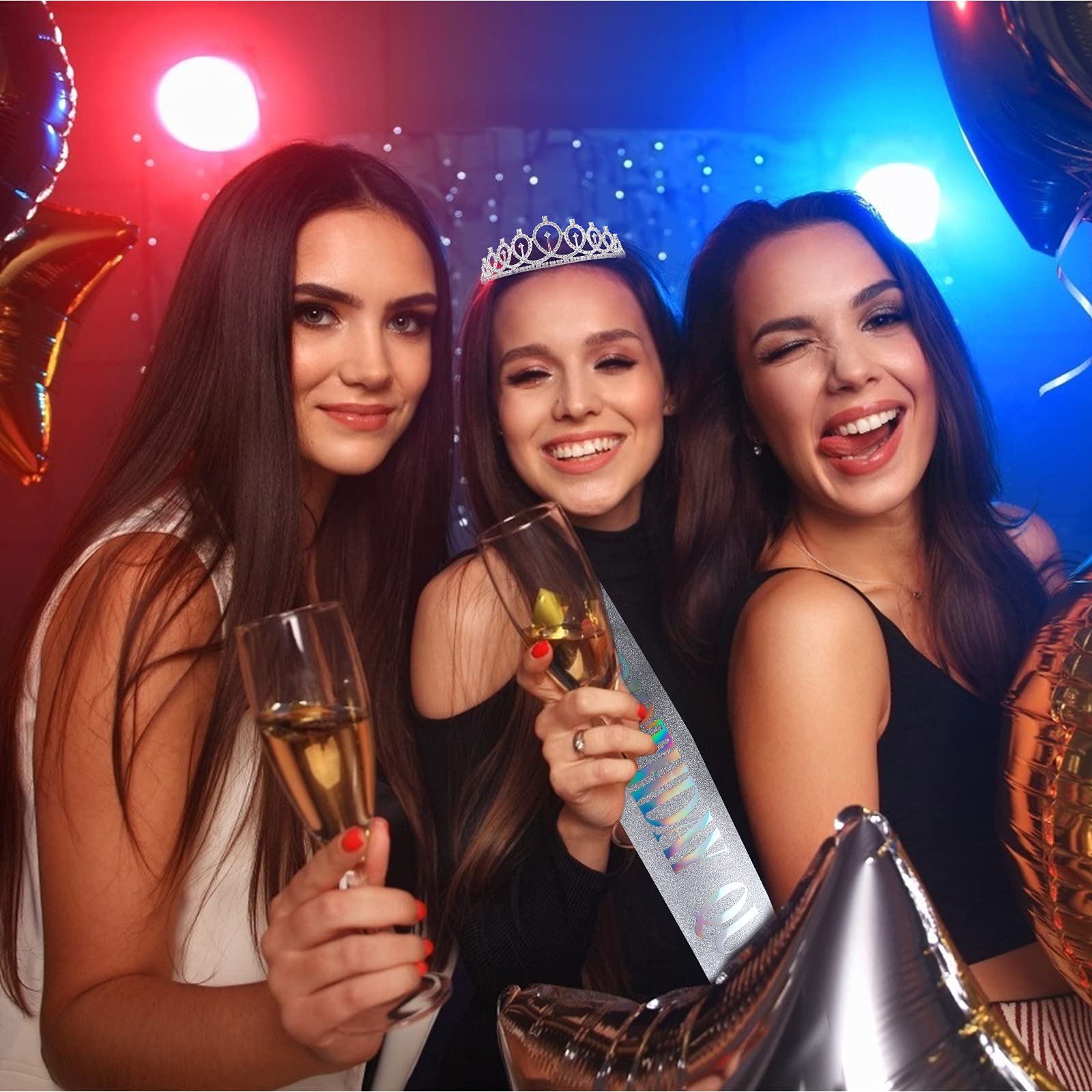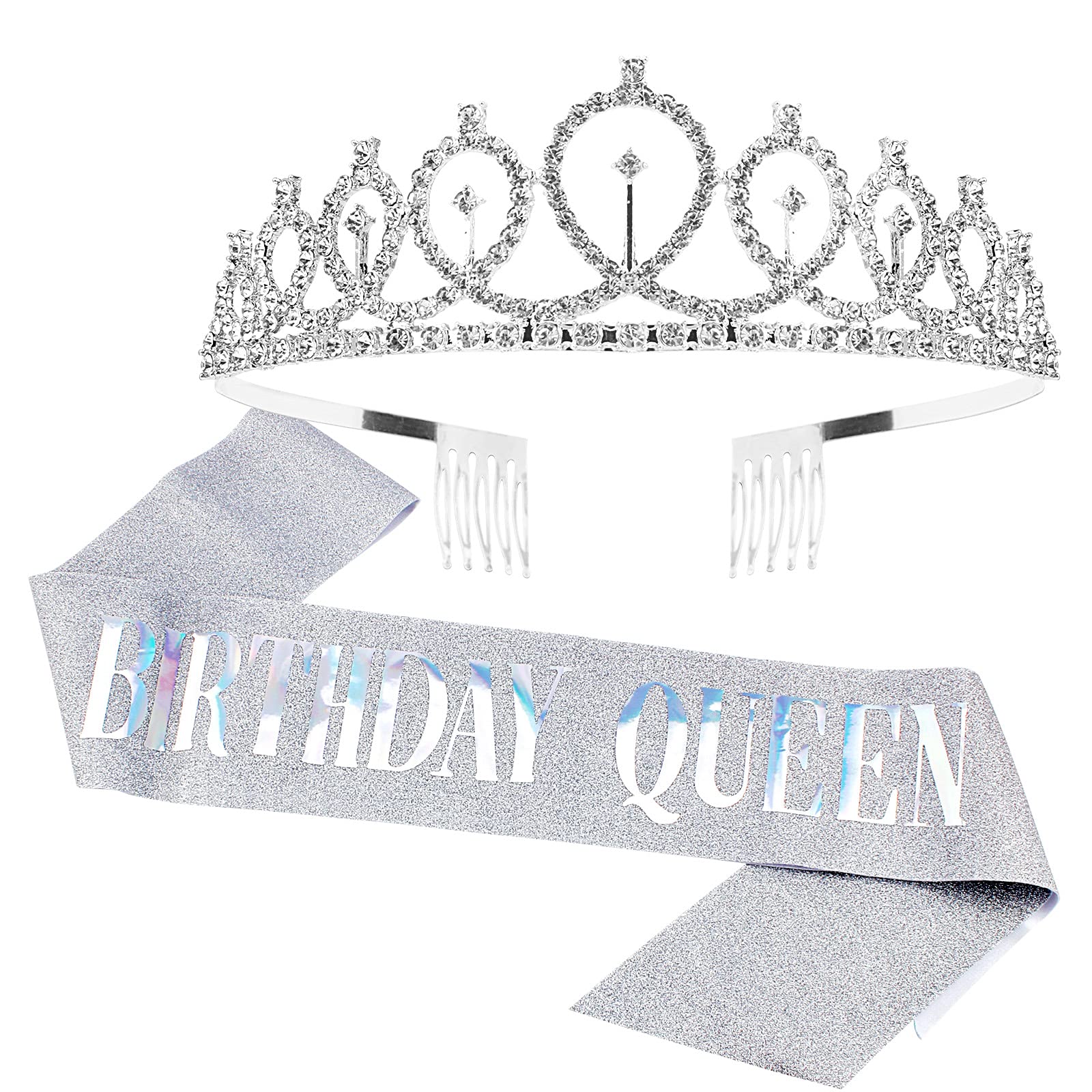 Silver "Birthday Queen" Sash + Rhinestone Tiara Gifts Set.