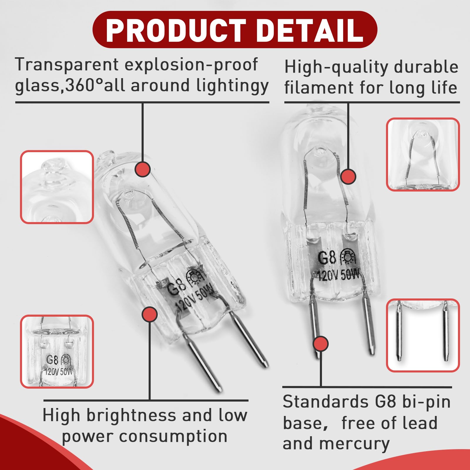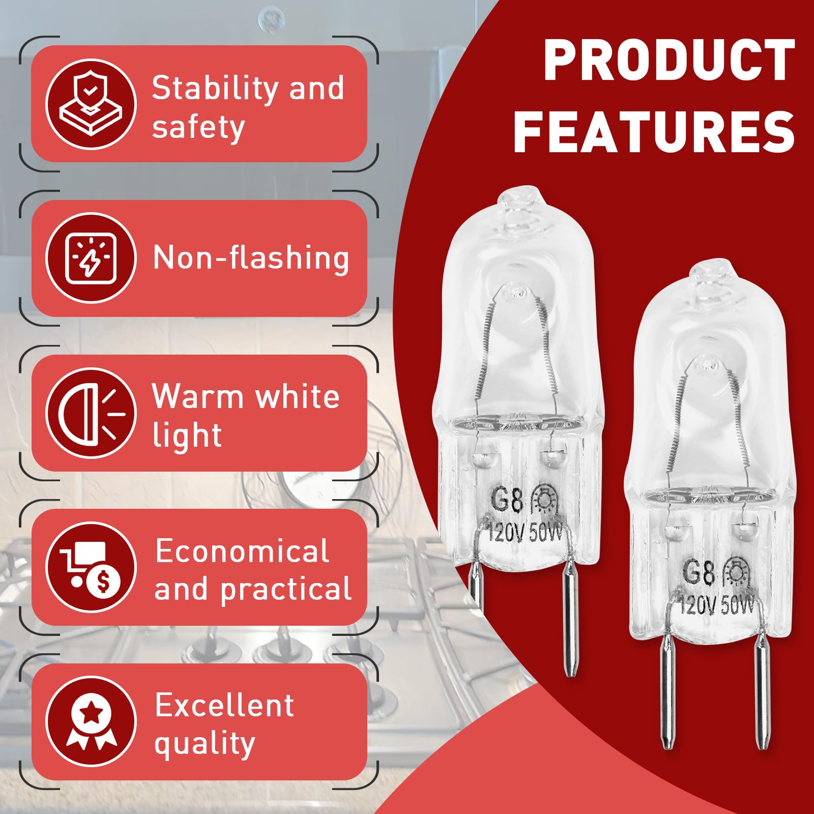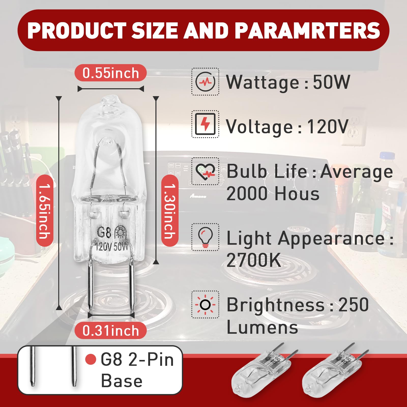 About G8 Halogen Bulb 50W:Warm 2700k soft white light, 2000 Hours bulb life, 0.5 inch width,1.65 inch length.The wide beam angle and dimmability add versatility and ambiance to your cooking space