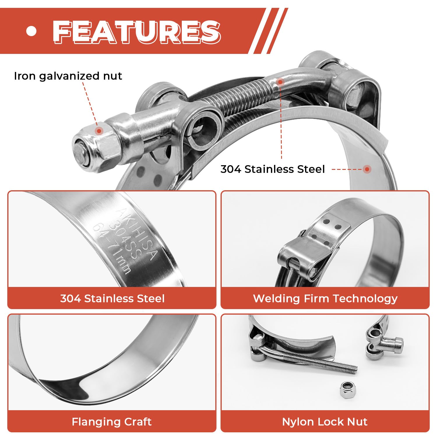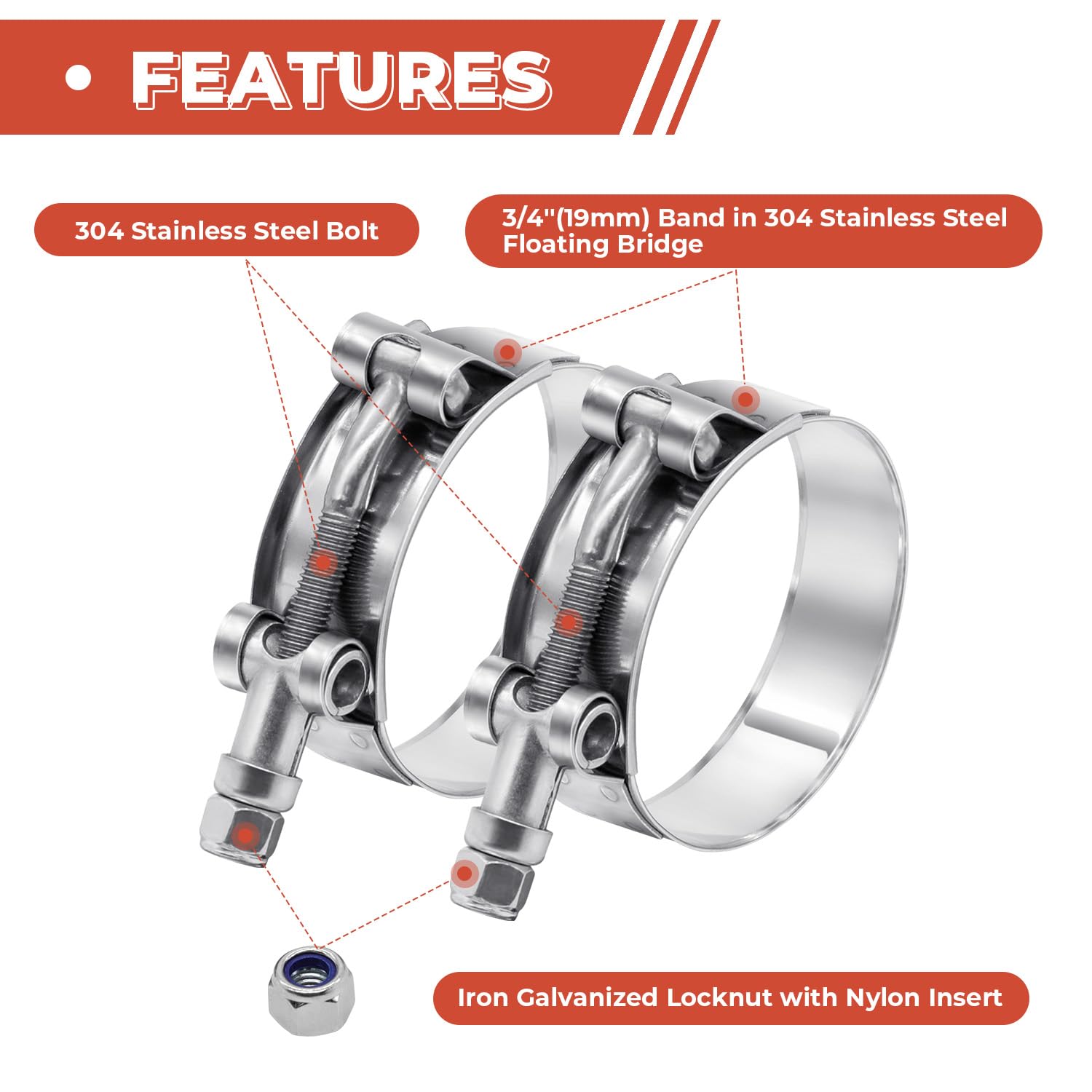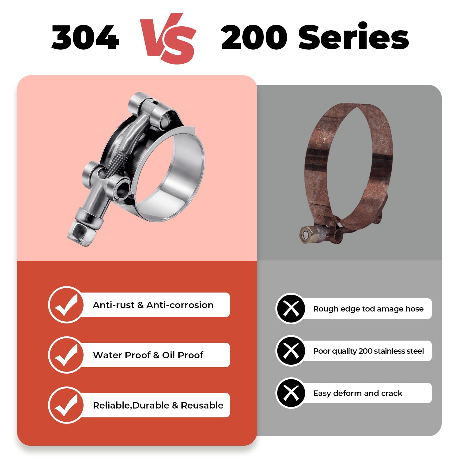 Superior Durability: Our T-Bolt Hose Clamps are made of high-quality stainless steel 304, providing superior durability and long-lasting performance. They are designed to withstand harsh conditions and resist corrosion, ensuring the clamps will securely hold your hoses in place for years to come.