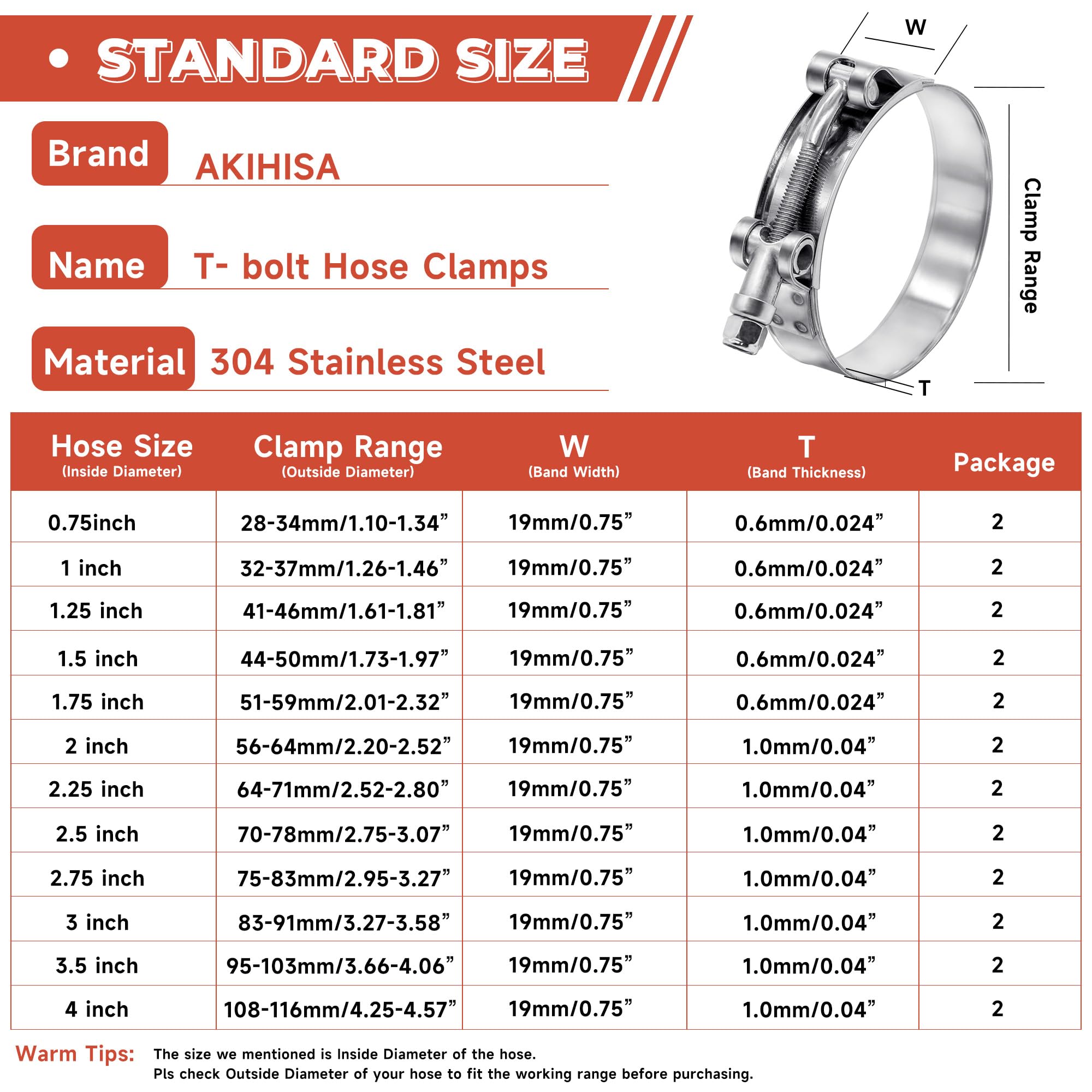 Secure and Reliable: 12 Sizes with a working range of 28mm-116mm and designed specifically for 0.75" -4'' hose ID(28mm-34mm for 0.75''; 32-37mm for 1''; 41-46mm for 1.25''; 44-50mm for 1.5''; 51-59mm for 1.75''; 56-64mm for 2''; 64-71mm for 2.25''; 70-78mm for 2.5''; 75-83mm for 2.75''; 83-91mm for 3''; 95-103mm for 3.5''; 108-116mm for 4'' hose ID), our T-Bolt Hose Clamps provide a tight and secure fit. The unique T-bolt design ensures a strong grip, preventing leaks and ensuring efficient performance.
