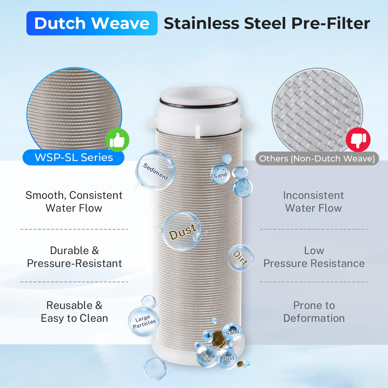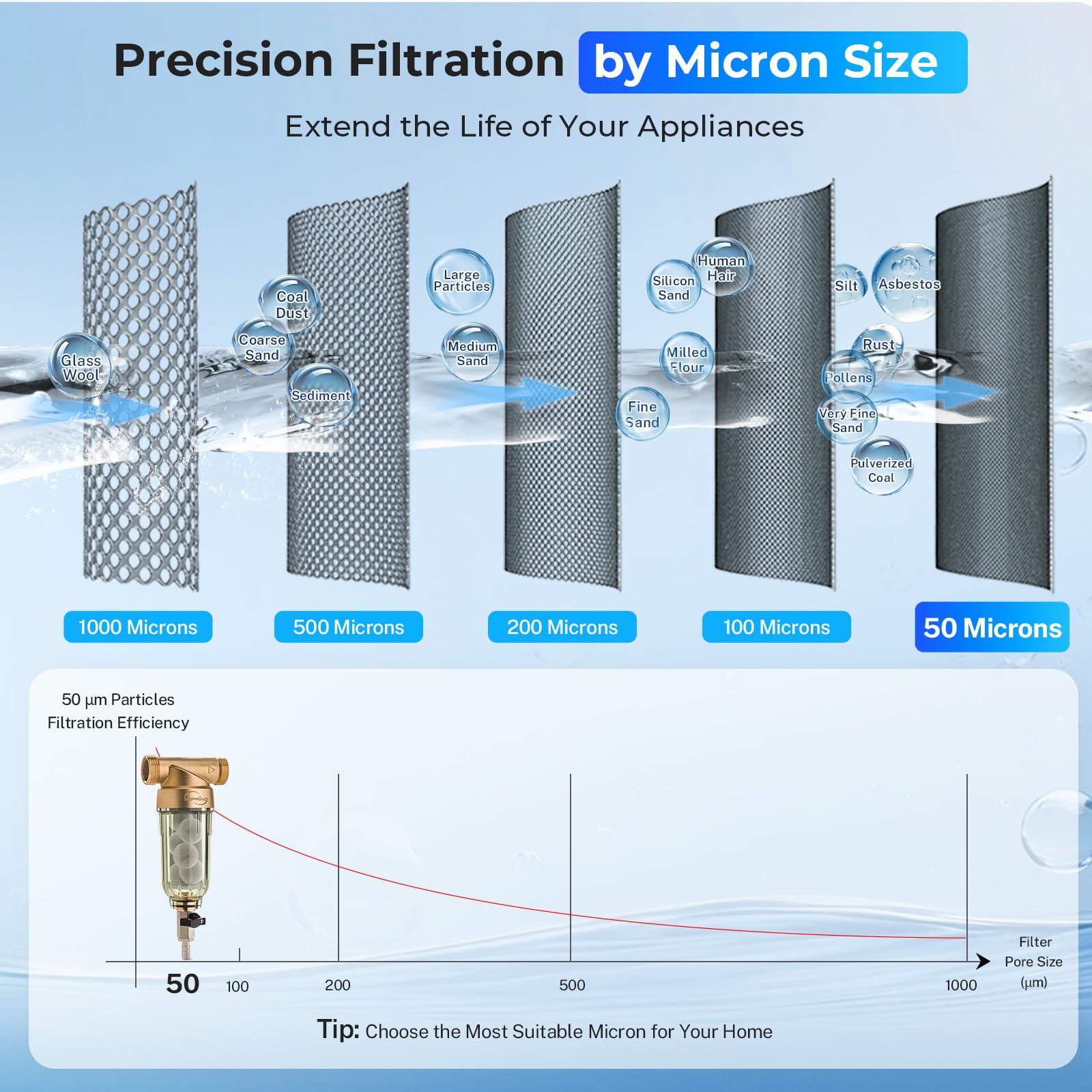 Rated at 100 Micron. Ideal first stage water filter for residential homes to reduce sediment, rust, dirt, sand, and large particles before water entering to a finer whole house water filtration system
