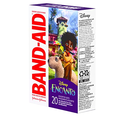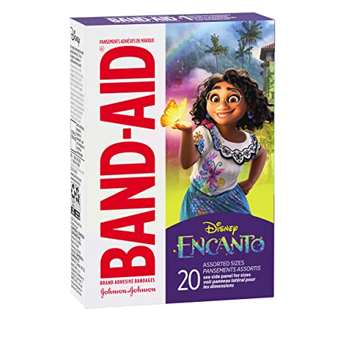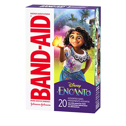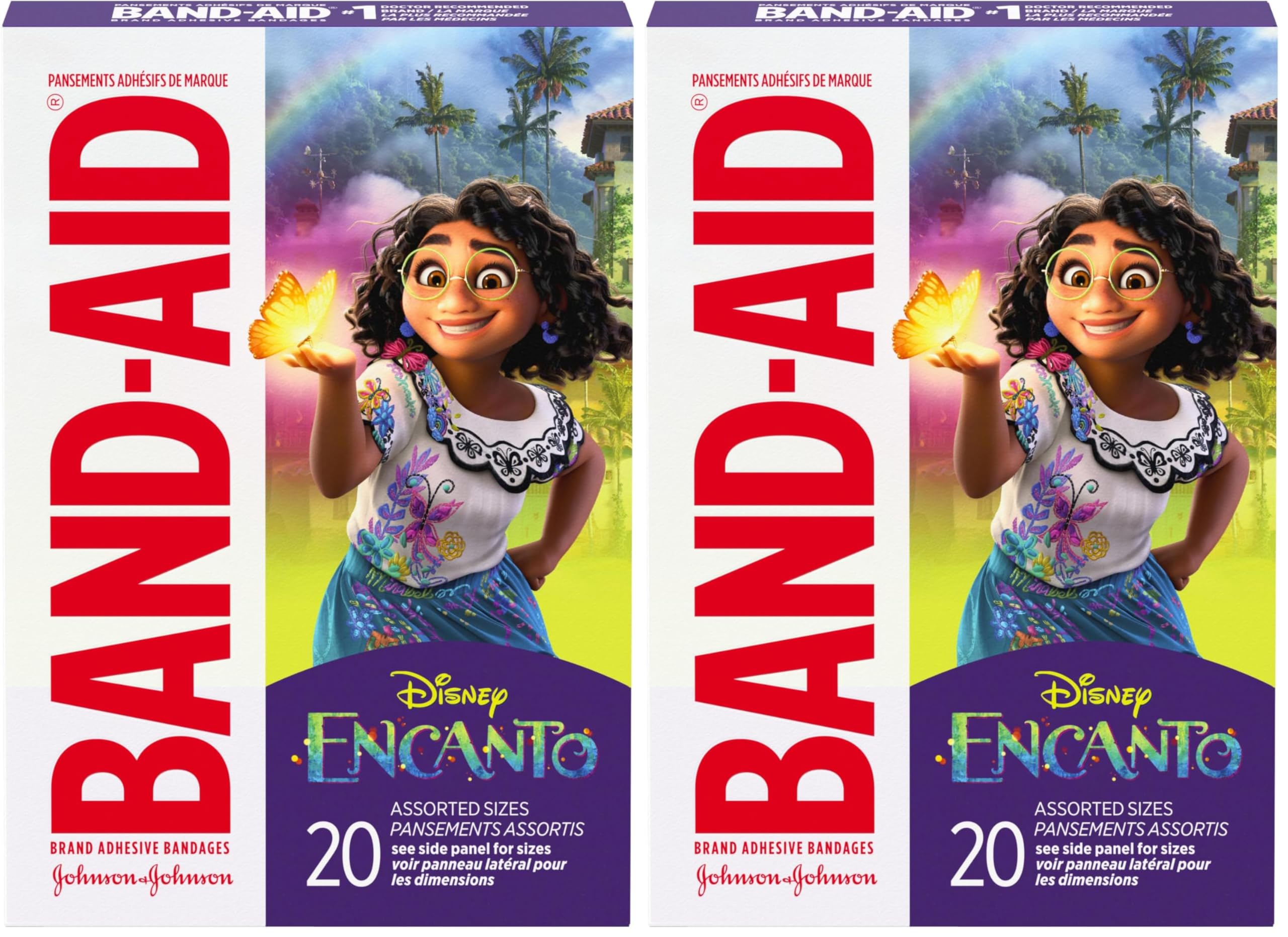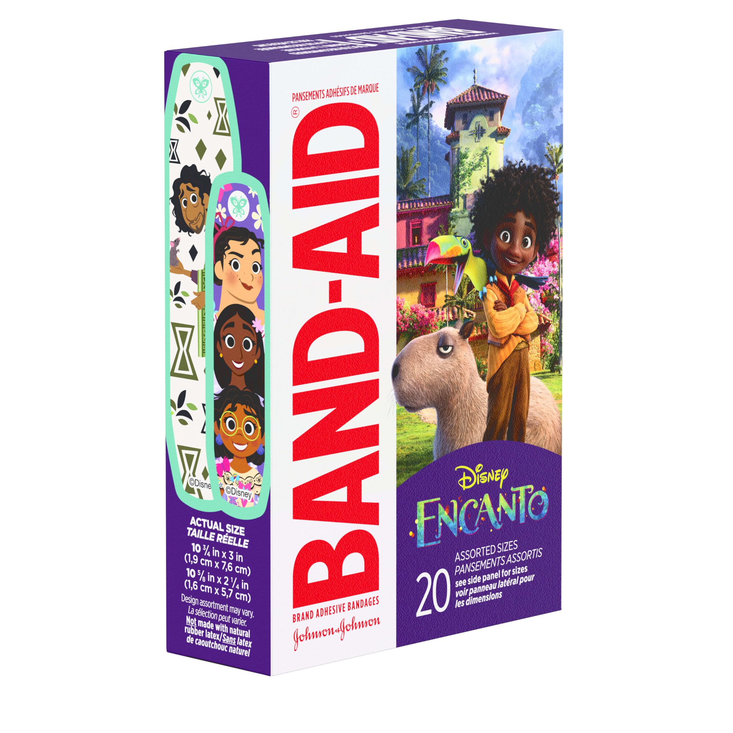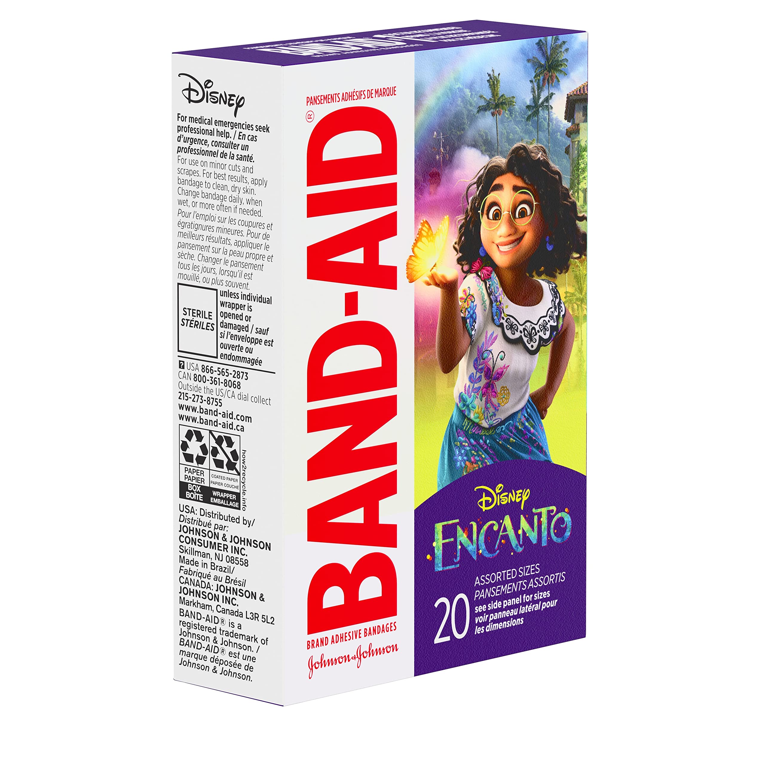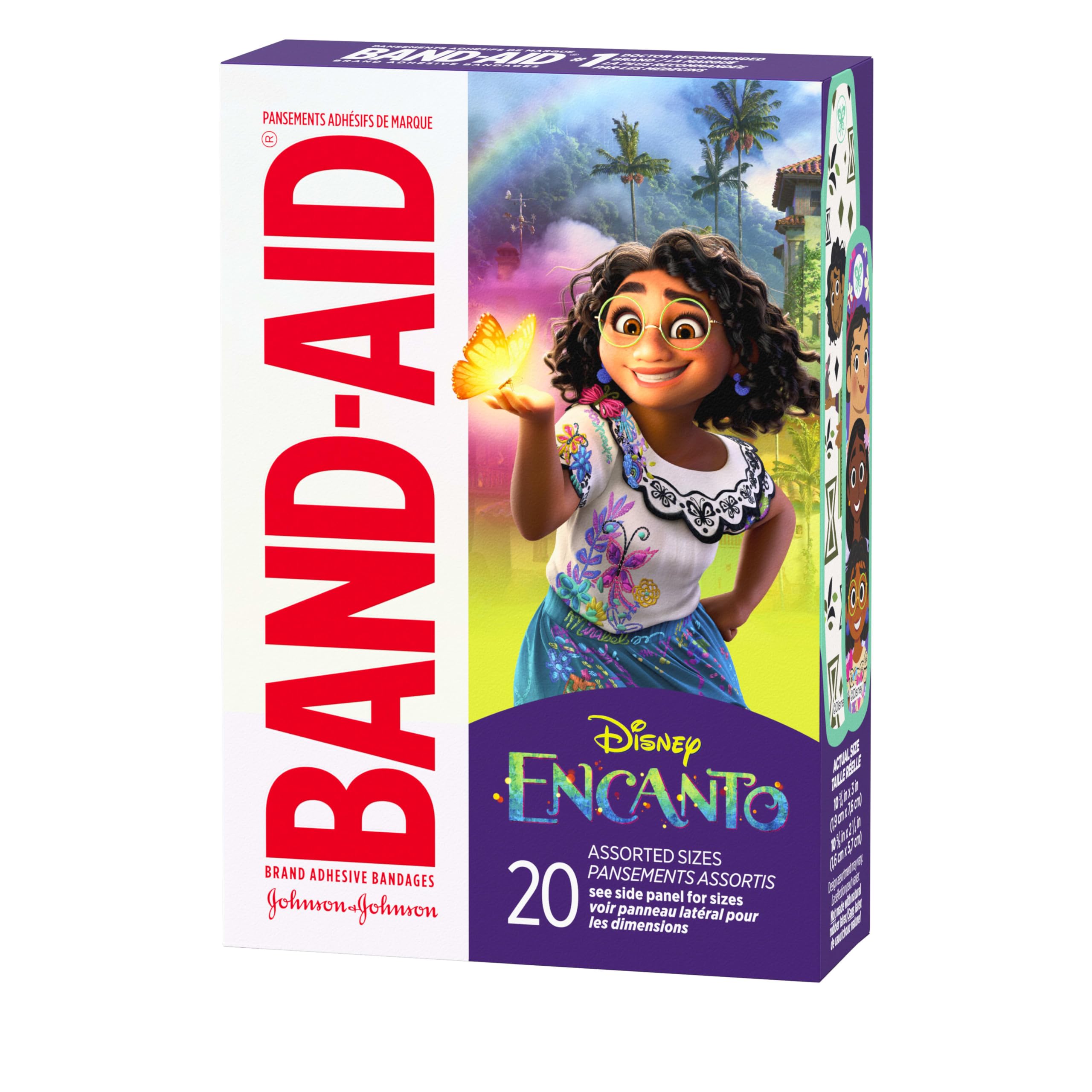 20-count box of decorative Encanto Band-Aid Brand Adhesive Bandages for kids and toddlers in assorted sizes to cover and protect minor cuts and scrapes to deliver daily wound protection