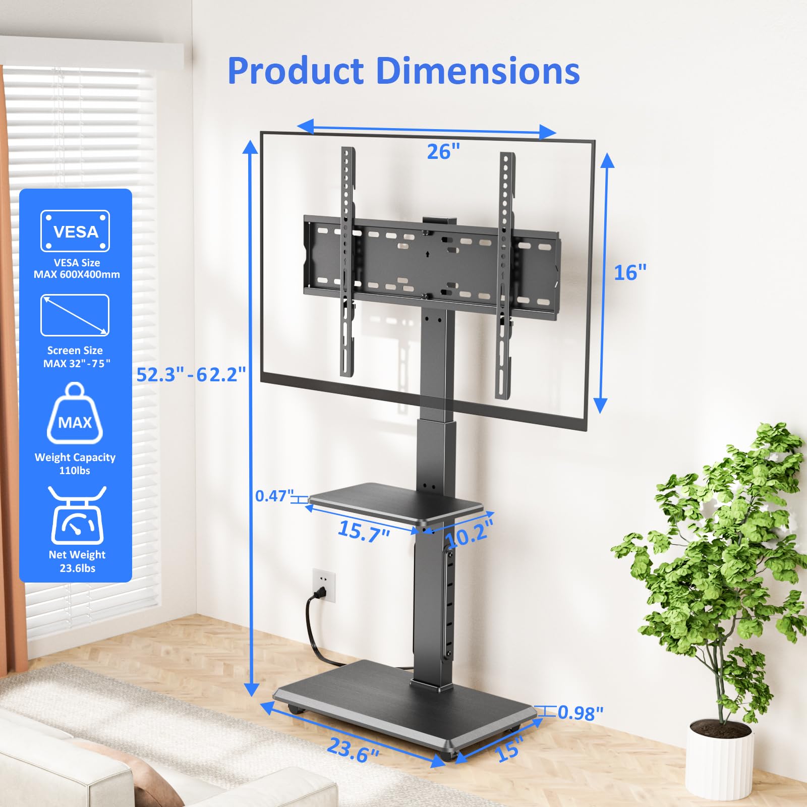 【Rolling TV Cart with Wheels】The portable TV stand is equipped with 4 durable 360° wheels that allow it to move smoothly across the floor. Two of the wheels are lockable castors, You can lock the wheels to keep it in place when you want to keep it stationary. Our TV stand is suitable for TVs from 32 to 75 inches. It can support TVs with a maximum weight of 110 pounds, maximum VESA size 600 x 400 mm.