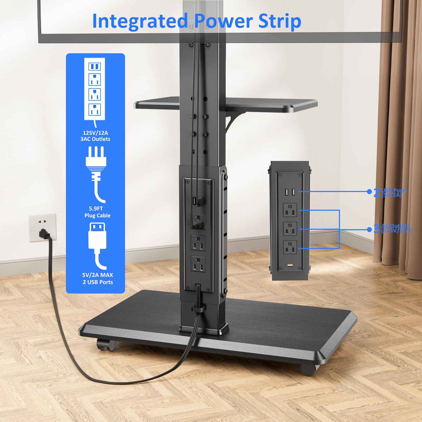 【Mobile TV Cart with Power Outlet】Afaloona TV Cart has built-in power outlet with 2 USB ports (5V/2A), 3 AC outlets (120V/12A). 6.5 ft long power cable allows for easy connection to a wall outlet. The stand can power multiple devices simultaneously, keeping your setup organized and tidy.