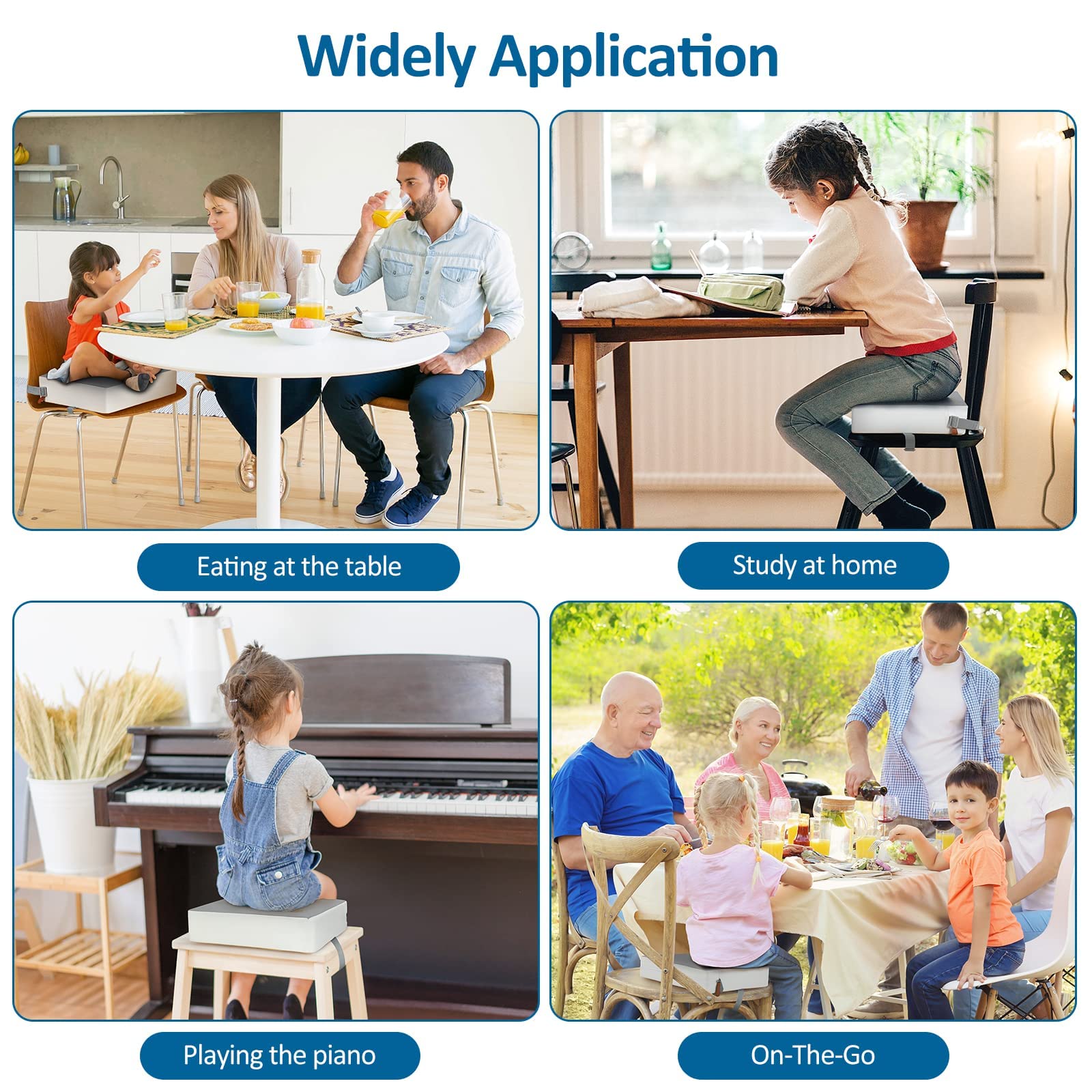 PORTABLE BOOSTER SEAT - The travel booster seat dining is a nice and light weight(0.66 OZ)booster cushion.The kitchen booster seat for chair is suitable for kichen,restaurant,floor and travel.Travel booster seat for table is easy to take with you when you one the go(Size:14.1 x 12.6 x 4 inches)
