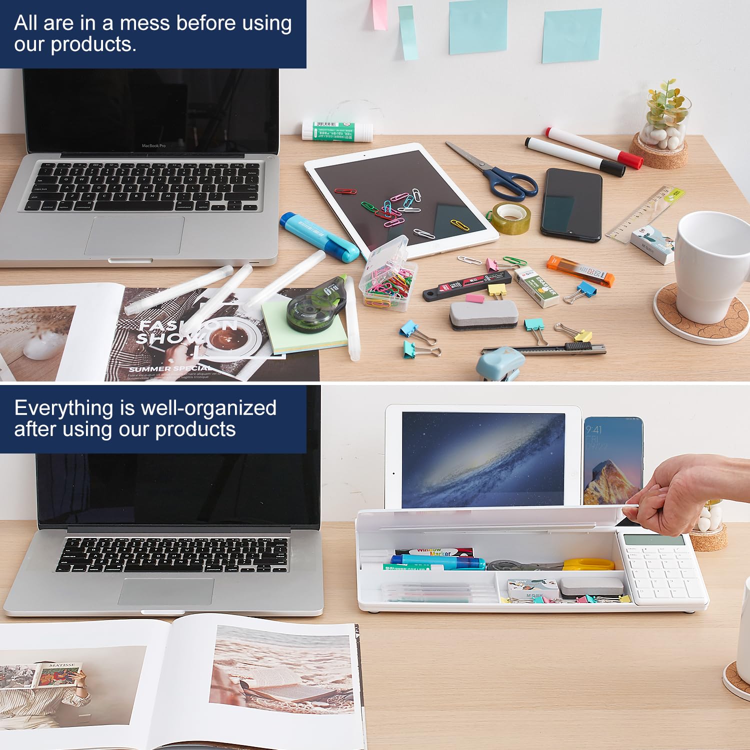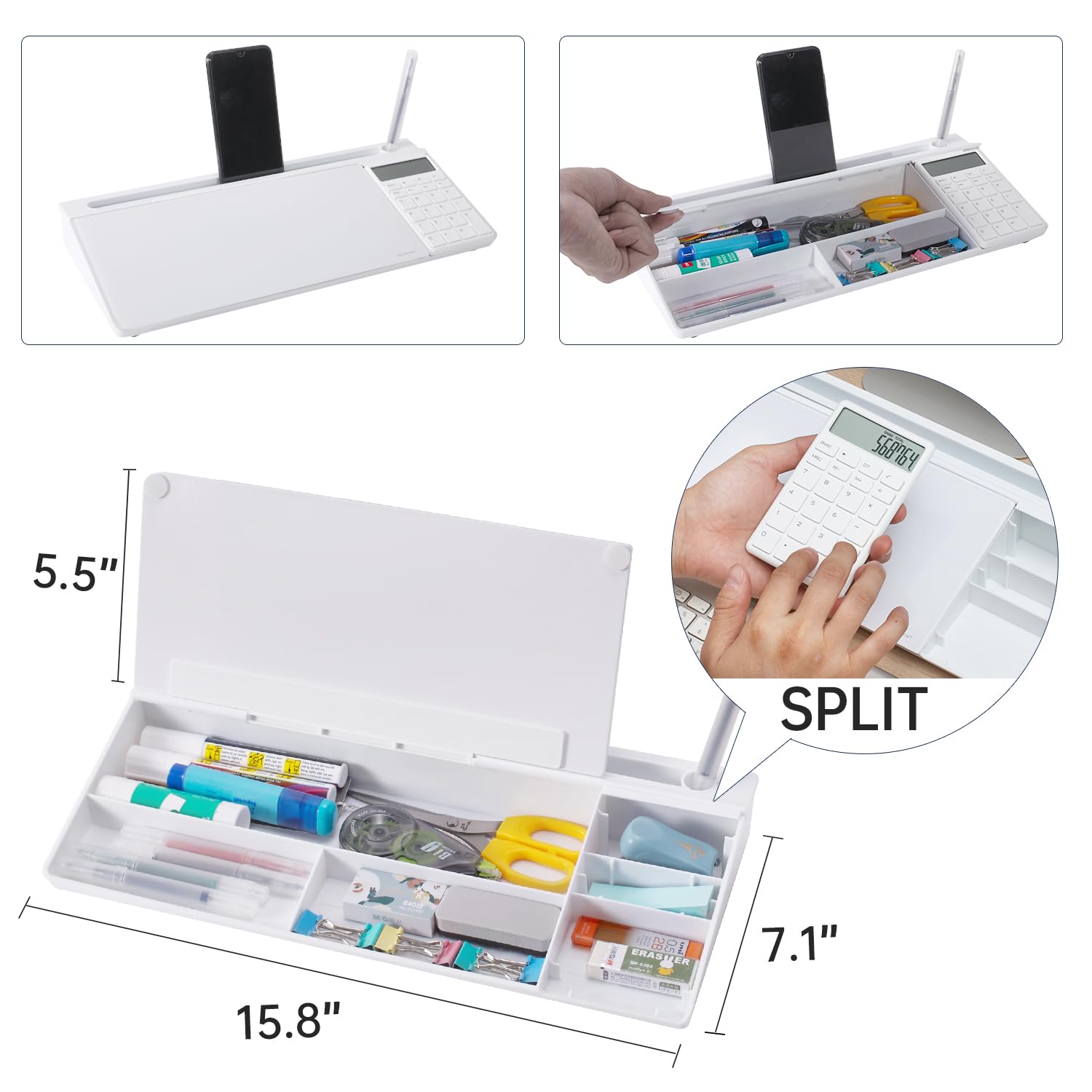 HIDDEN STORAGE & PAD/MOBILE TRAY: De-clutter your desk by storing markers, magnetic eraser and other desktop accessories in the opening drawer or place markers on the accessory tray for quick access. And one more long tray on the top of the dry erase white board for your pad or mobile.