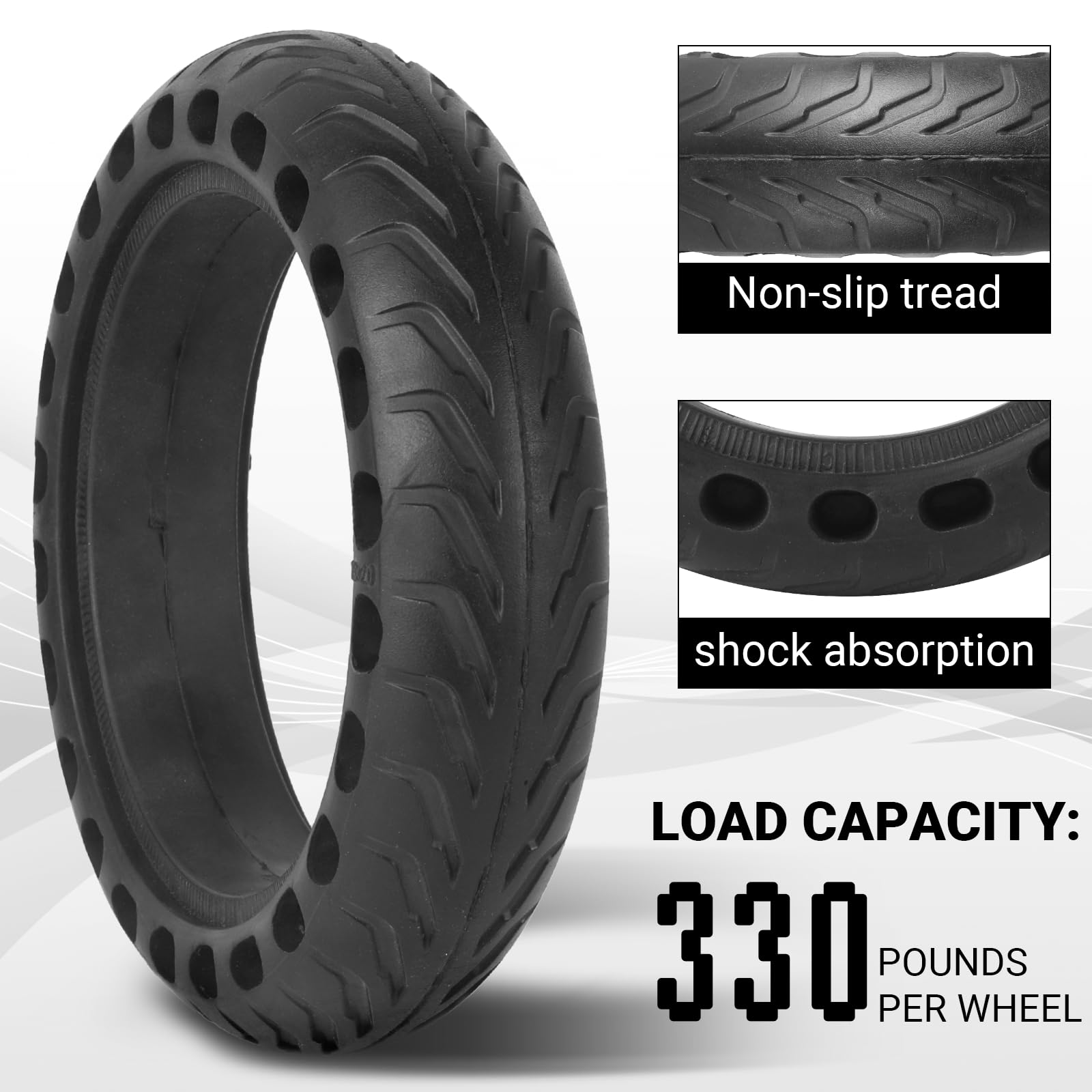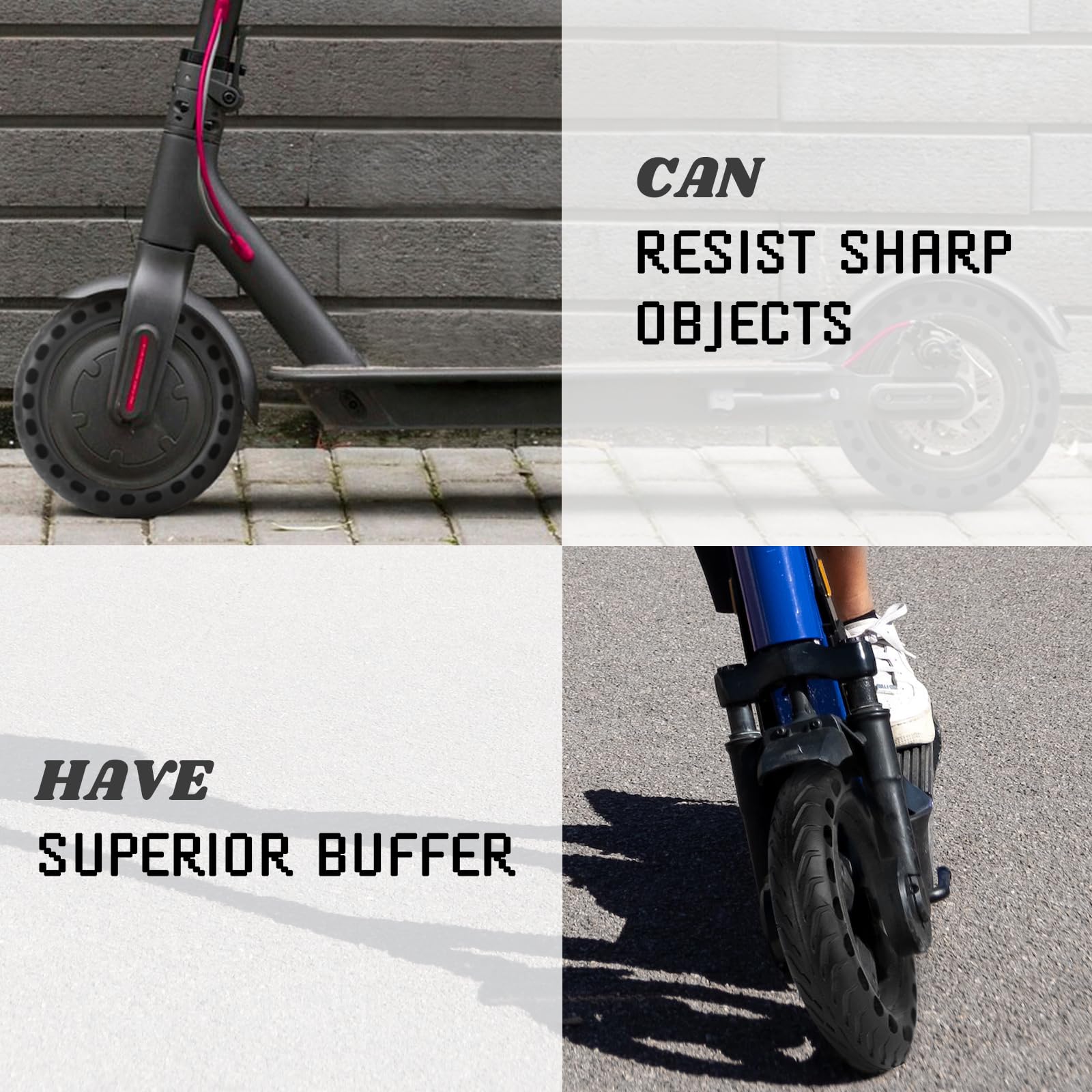 Innovative 8.5x2 Solid Scooter Tire Technology:8 1/2” Electric Scooter Solid Tires resist sharp objects, these power scooter tires eliminate the need for patches and inflation, So can be used on uneven road. Boasting superior cushioning, the 8.5-inch solid scooter tires ensure a stable and secure ride, surpassing traditional pneumatic options.