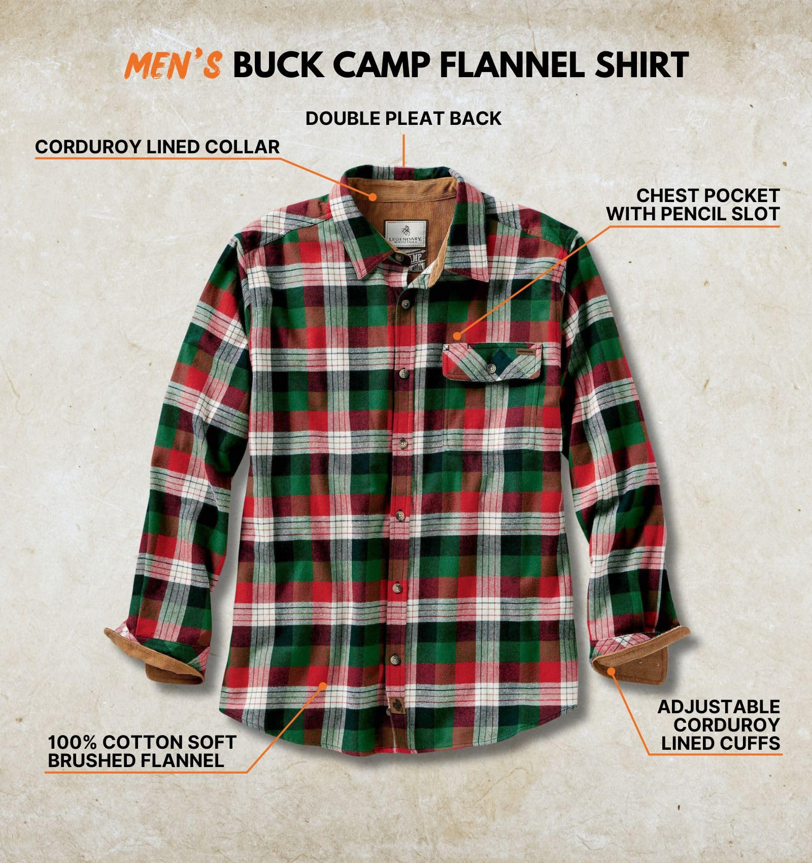 Description Our original single pocket flannel - The Buck Camp Flannel Shirt is the perfect weight to wear alone or layered over a t-shirt or under a shirt jacket. The traditional style and signature corduroy details offer unmatched durability, while the relaxed fit and brushed cotton flannel provide ultimate comfort. With multiple exclusive plaids and solids, they're suitable for any occasion from the woods to the office. The Buck Camp Flannel Shirt gives you an incredible "bang for your buck"! Big & Tall sizes are designed for men over 6'2" and add 2" in body length and 1-1⁄2" in sleeve length.