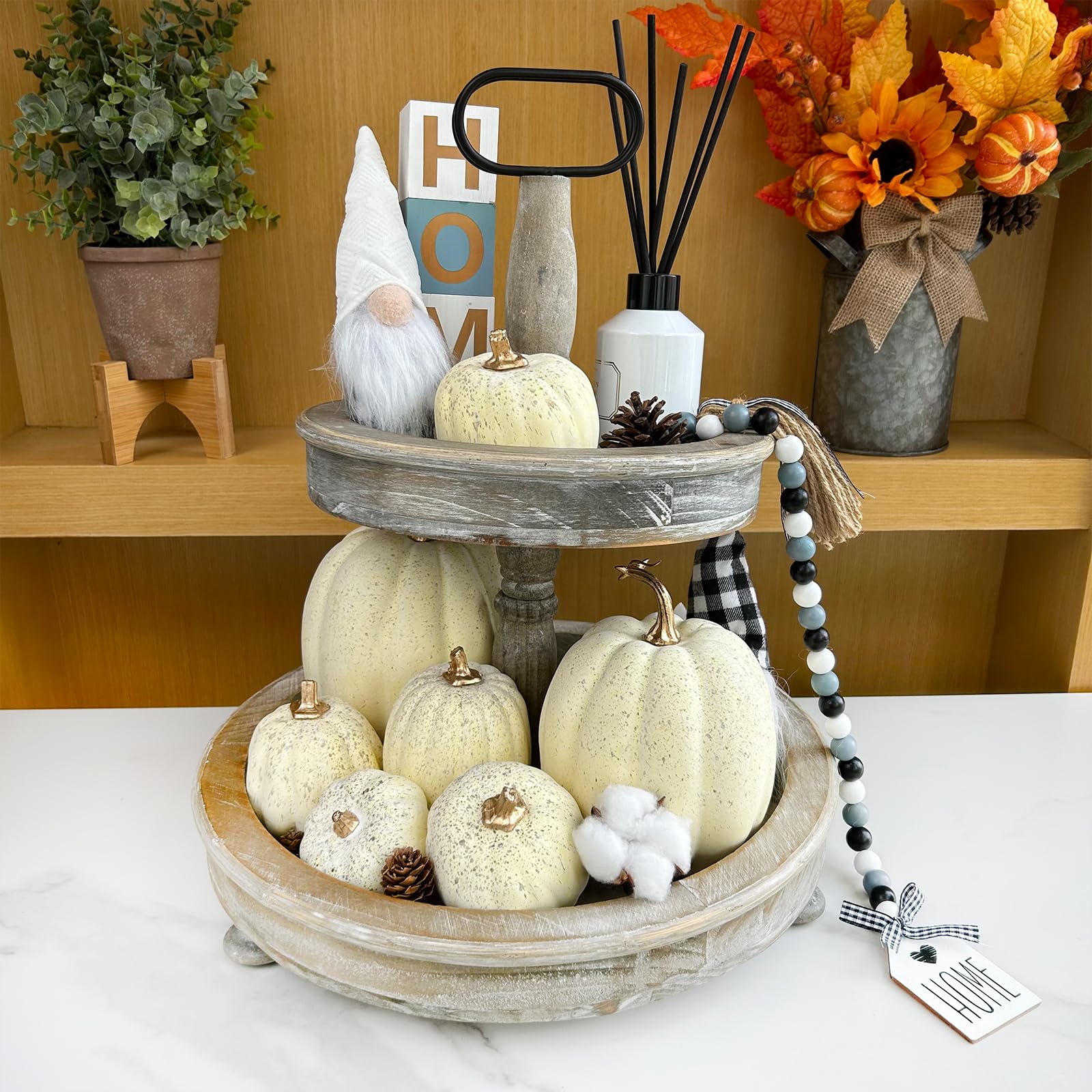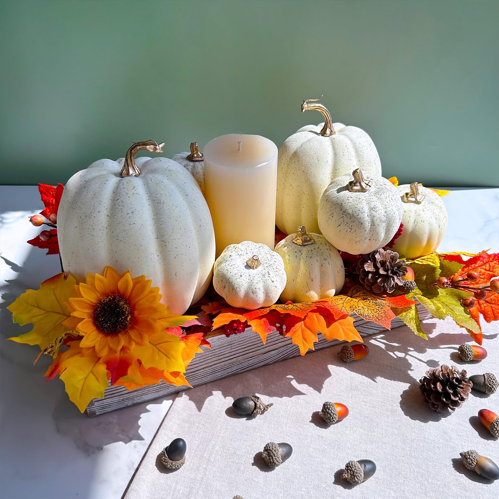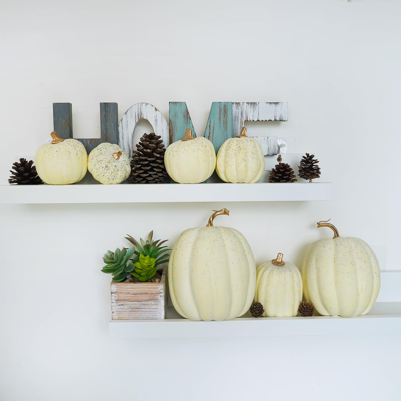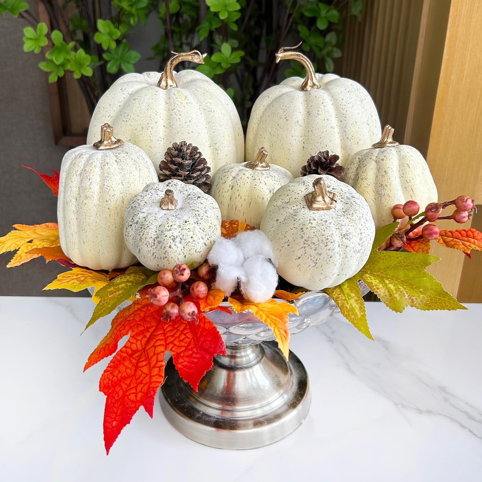Quantity: Package includes 7 pcs assorted artificial cream pumpkins, enough for your festive decorations. They make an absolutely stunning autumn centerpiece! Decorate your home for the harvest season with these faux cream pumpkins. They can be used to decorate the kitchen, dining table, study room, mantel, shelves, coffee table windowsill, etc. Or combine them with artificial gourds, corn, and other harvest veggies to create an autumn-inspired display.