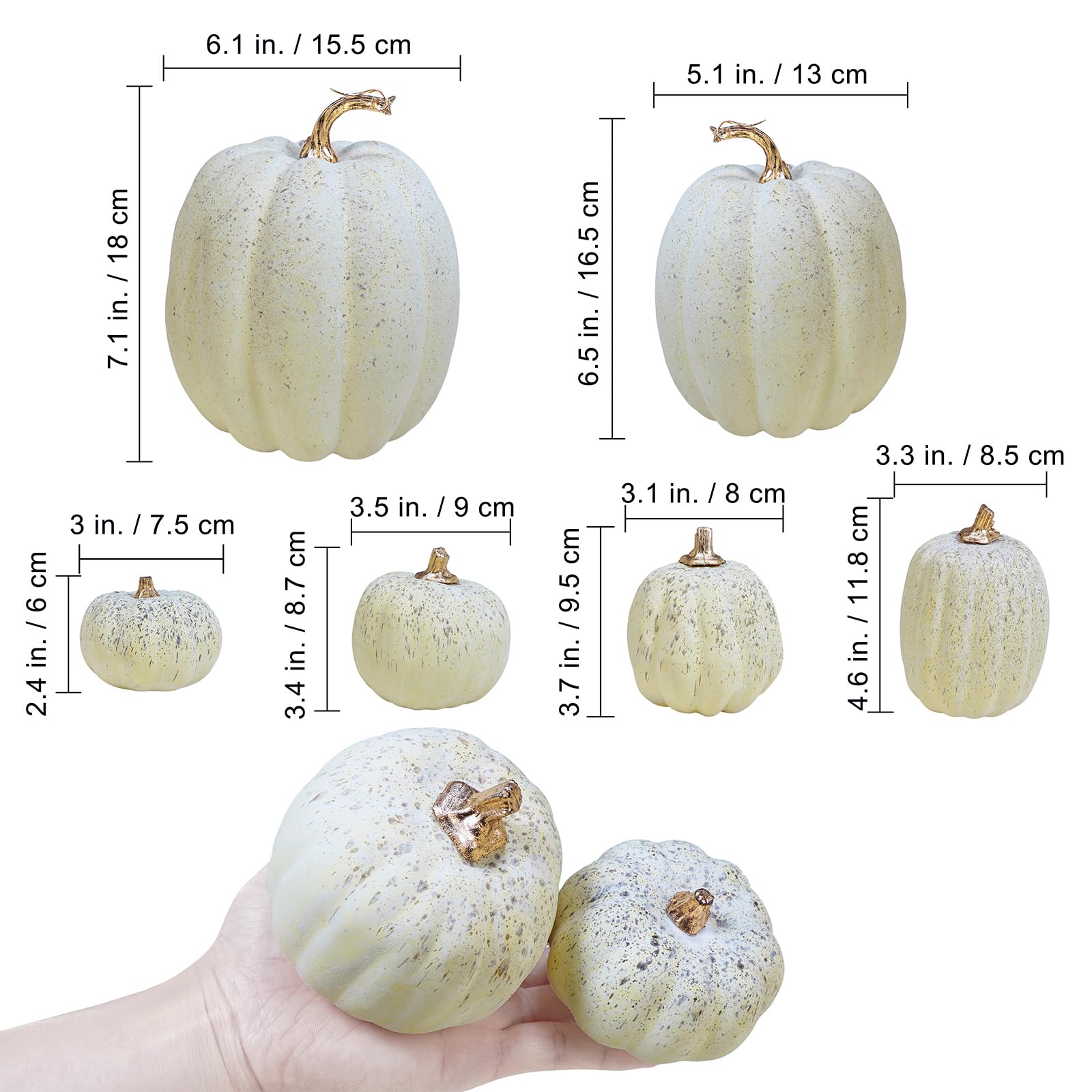 Size: These assorted rustic pumpkins measure about 3"-6.1" wide and 2.4"-7.1" tall, they are perfect for meeting your fall decorative needs. Each of the 7 pumpkins has its own size, allowing for a natural look. You can use the different sizes to bring texture and fun into your decor. Put these decorative pumpkins on any places as stand-alone centerpiece, or you can mix and match other autumn decorations to display all over the house for a more elaborate display.