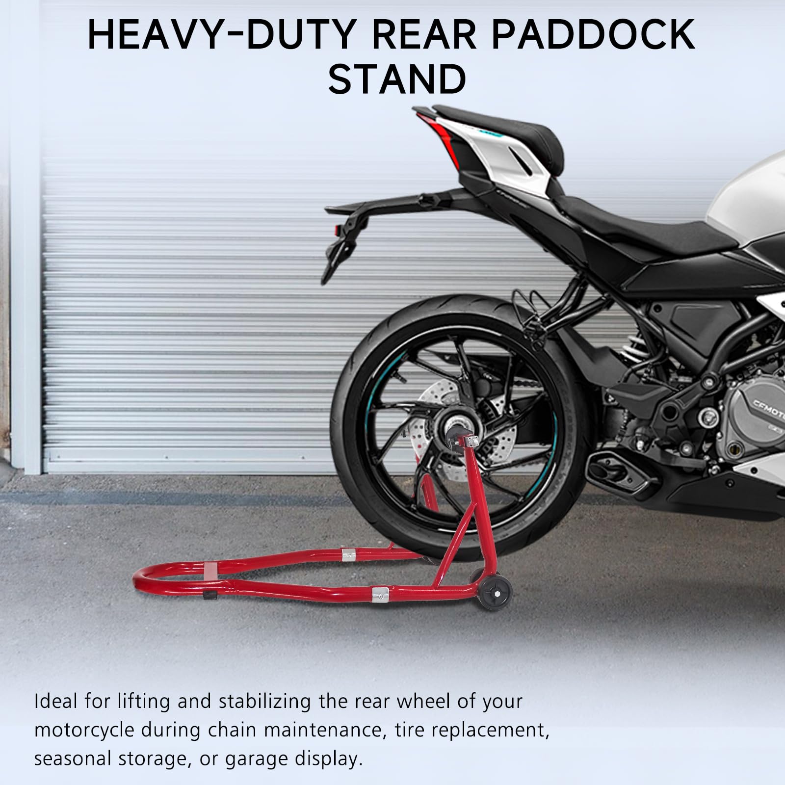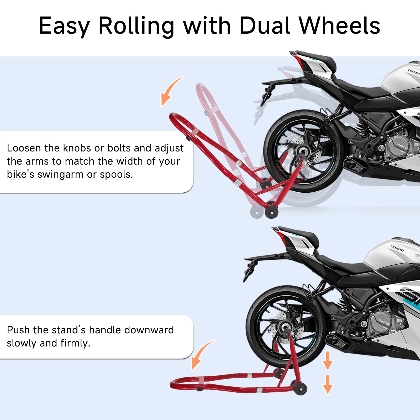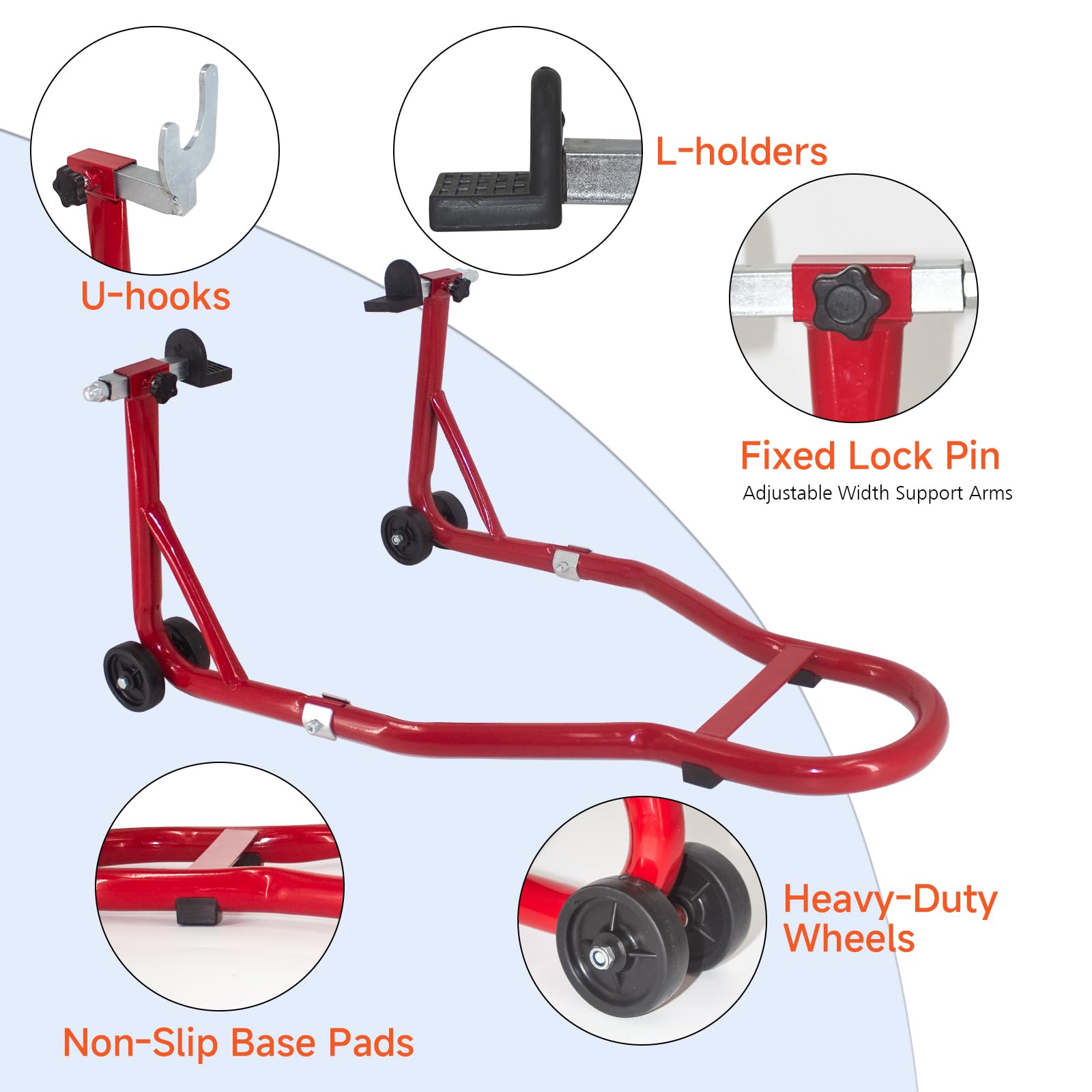 DURABLE HEAVY-DUTY CONSTRUCTION: The front and rear motorcycle stand combo is designed for maximum convenience and durability, built with heavy-duty steel construction to withstand tough conditions. This motorcycle rear stand and paddock stand set provides a safe, stable, and reliable solution for lifting, supporting, and manipulating your motorcycle during maintenance, cleaning, tire changes, or long-term storage.