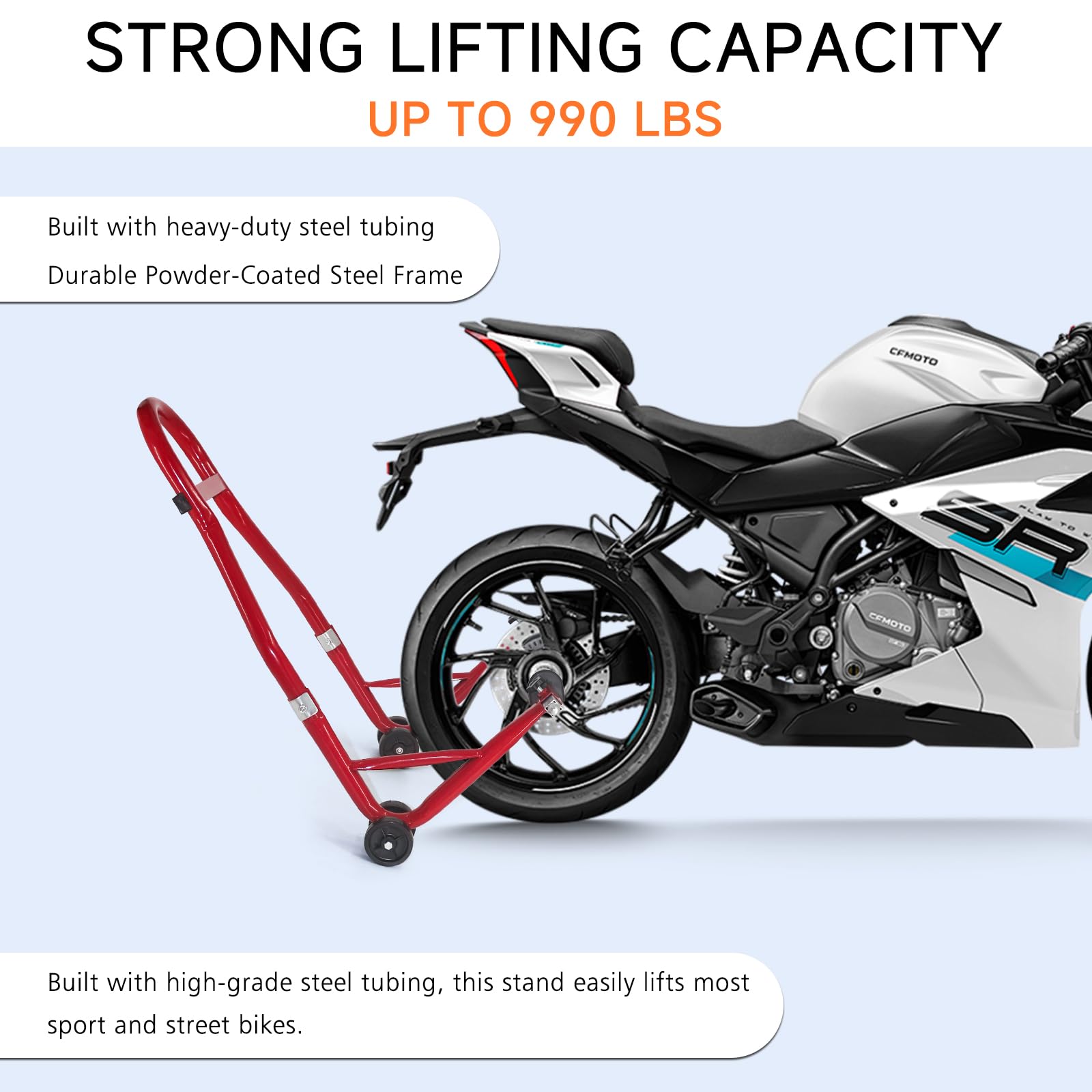 SECURE AND STABLE SUPPORT: With a robust 990 lbs lifting capacity, this heavy-duty motorcycle stand and motorcycle rear paddock stand provides safe and reliable leverage to lift your bike off the ground up to 13.6 inches in height, while its four smooth-rolling PP caster wheels enhance stability, balance, and maneuverability for effortless motorcycle maintenance, tire changes, and garage storage.