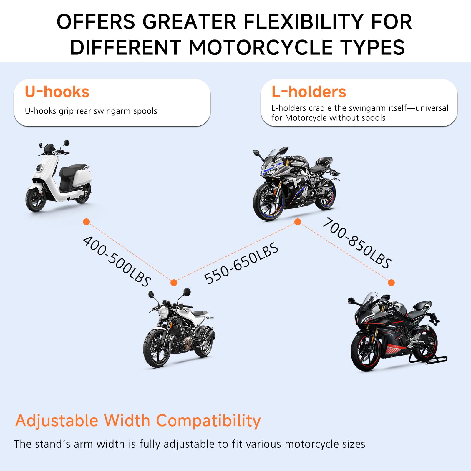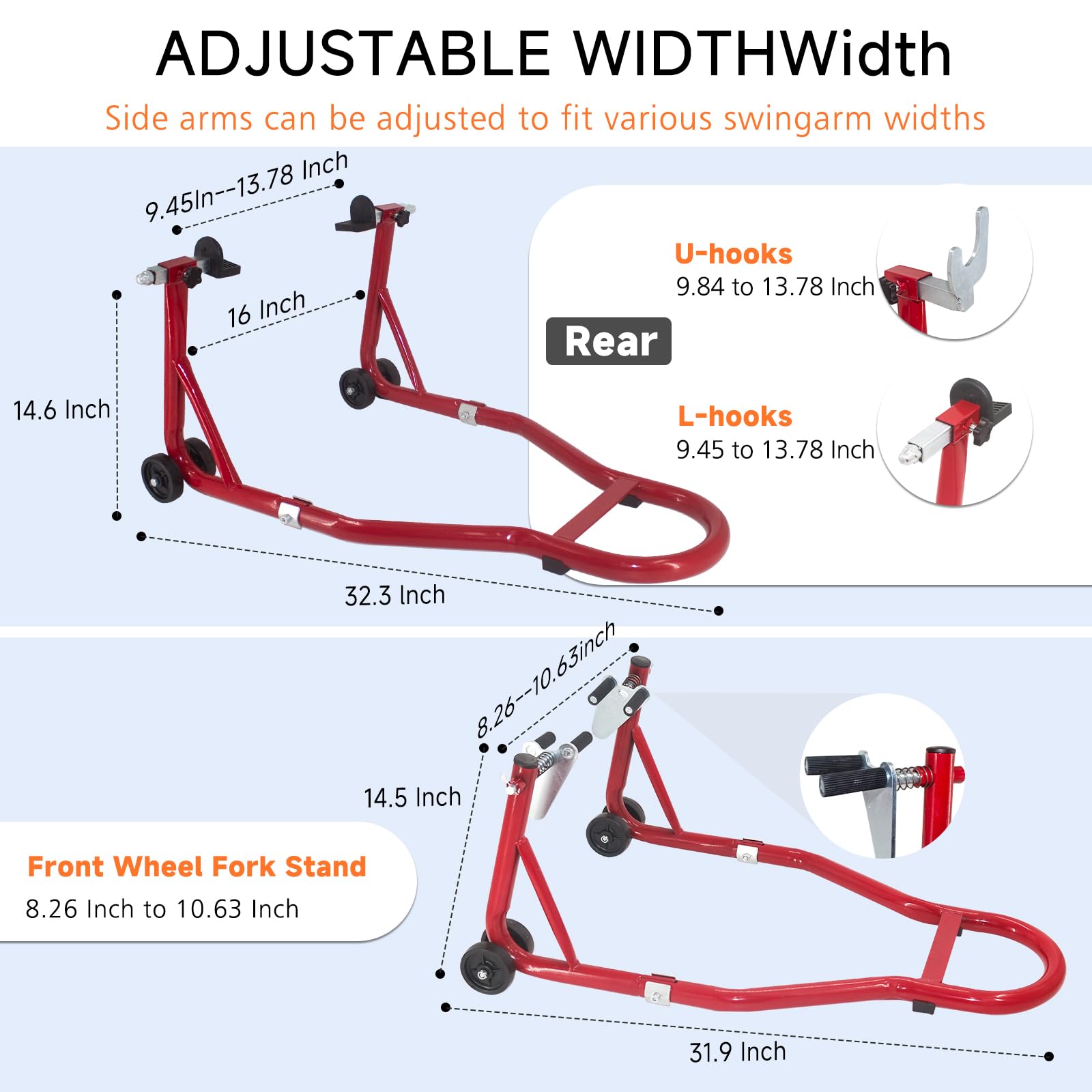 ADJUSTABLE WIDTH FOR UNIVERSAL FIT: Front Fork U-Shape Stand: Fits fork widths 9.84" – 13.78".Rear Swingarm L-Shape Stand with Spool Adapters: Fits swingarm widths 9.45" – 13.78", with protective rubber padding to prevent scratches.This adjustable design makes it compatible with most sport bikes, including Yamaha, Honda, Suzuki, Kawasaki, BMW, and more.