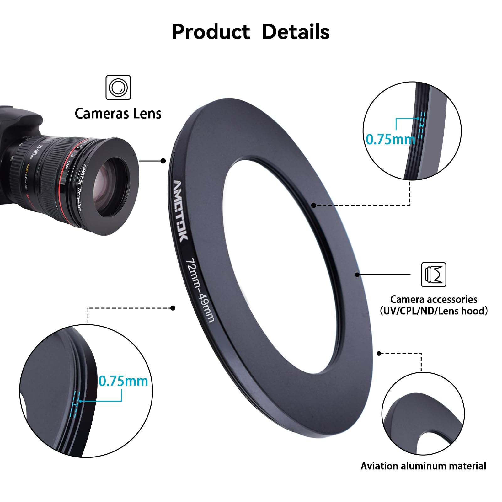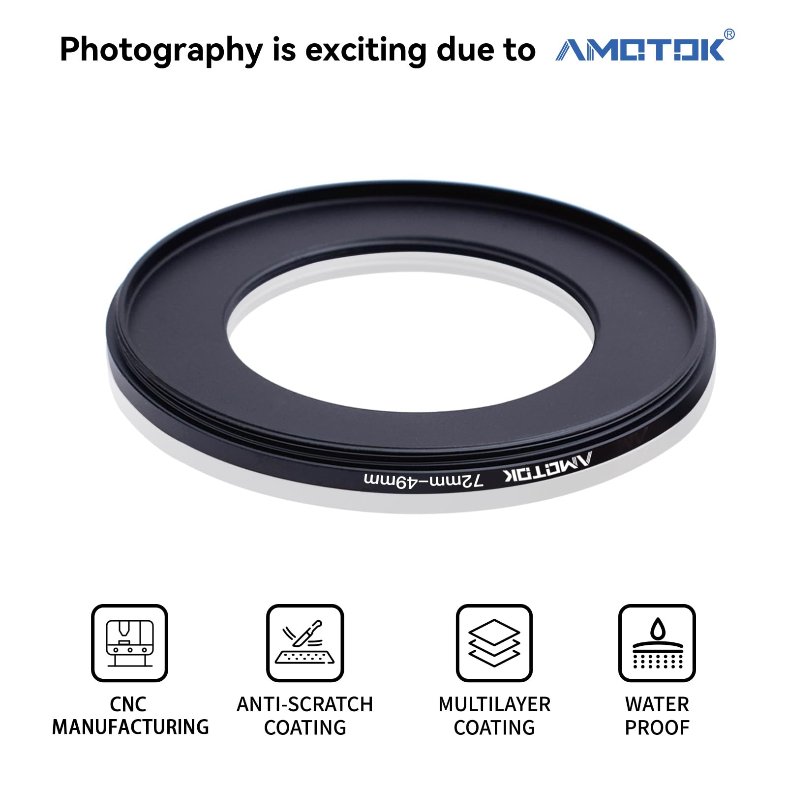 【2】AMOTOK The ring adapter easily screws onto the front of any 72mm lens,and converts the thread size of your lens to the thread size of any other 49mm accessory(such as filters,hoods,flashes and lens converters),and other 49mm accessories.