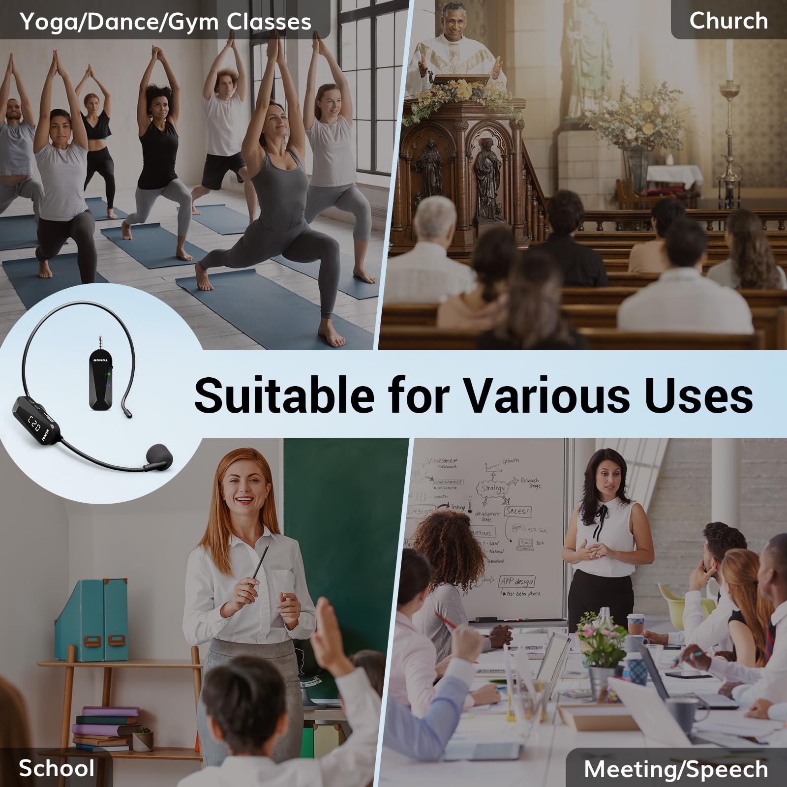 Adjustable Frequency & Versatile: Offers 20 adjustable frequency channels to avoid signal interference and minimize disruptions; also supporting simultaneous use of up to 15 sets; perfect for yoga instructors, dance teachers, churches, conferences, speeches, promotions, and more