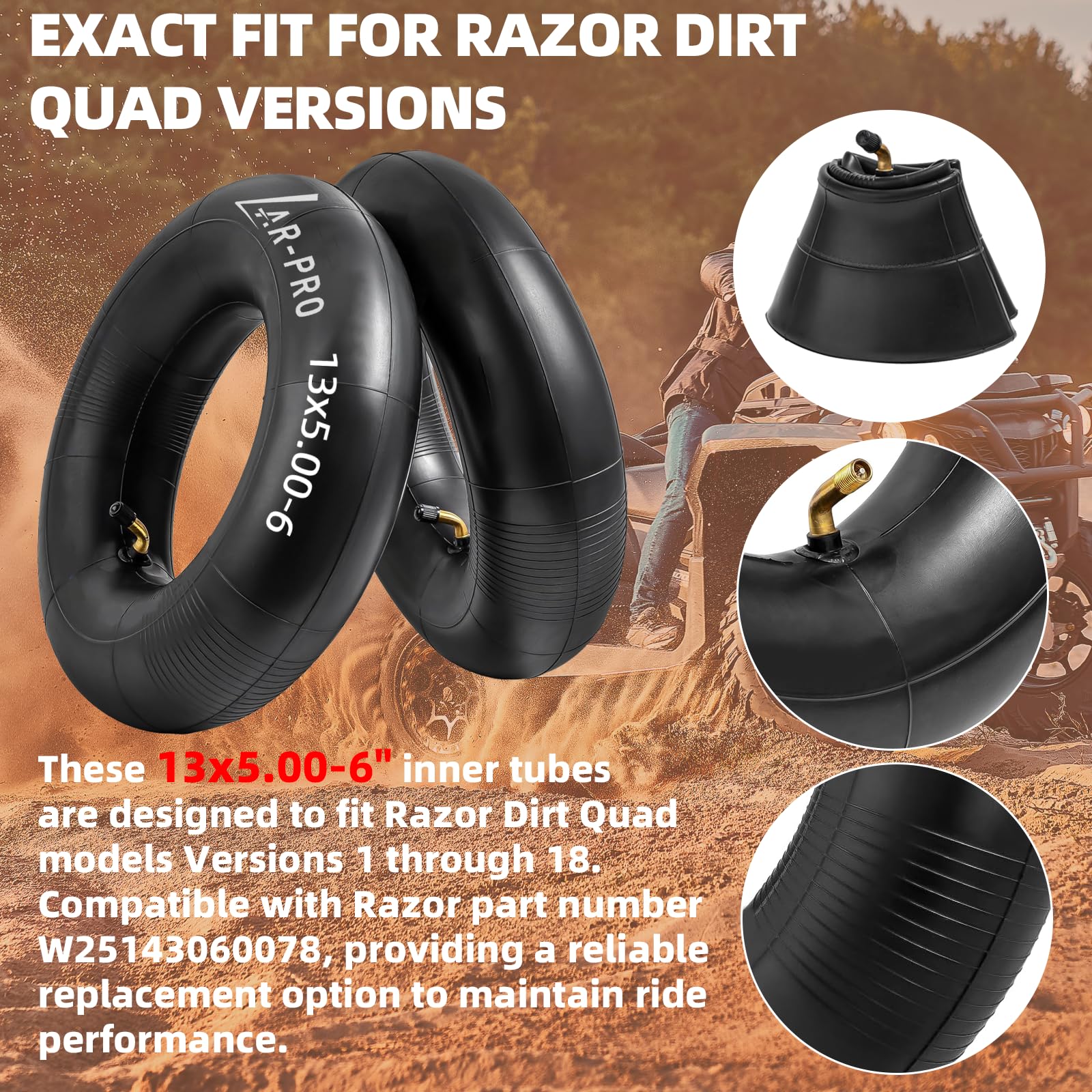 Exact Fit for Razor Dirt Quad Versions - These 13x5.00-6" inner tubes are designed to fit Razor Dirt Quad models Versions 1 through 18. Compatible with Razor part number W25143060078, providing a reliable replacement option to maintain ride performance.