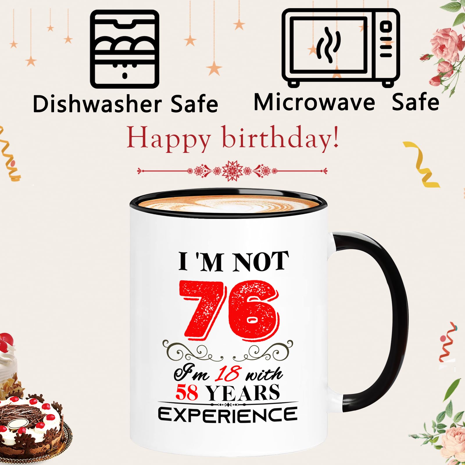 【Birthday Gift】: This funny "I'm not 76, I'm 18 with 58 years experience" Mug is the perfect birthday gift for a 76 year women men! Give it to your mom, dad, papa, mama, brother, sister, husband, wife, aunt, uncle, cousin, son, daughter, boyfriend, girlfriend, boss, coworkers, bestie, granddaughter, or your best friend for her he birthday.