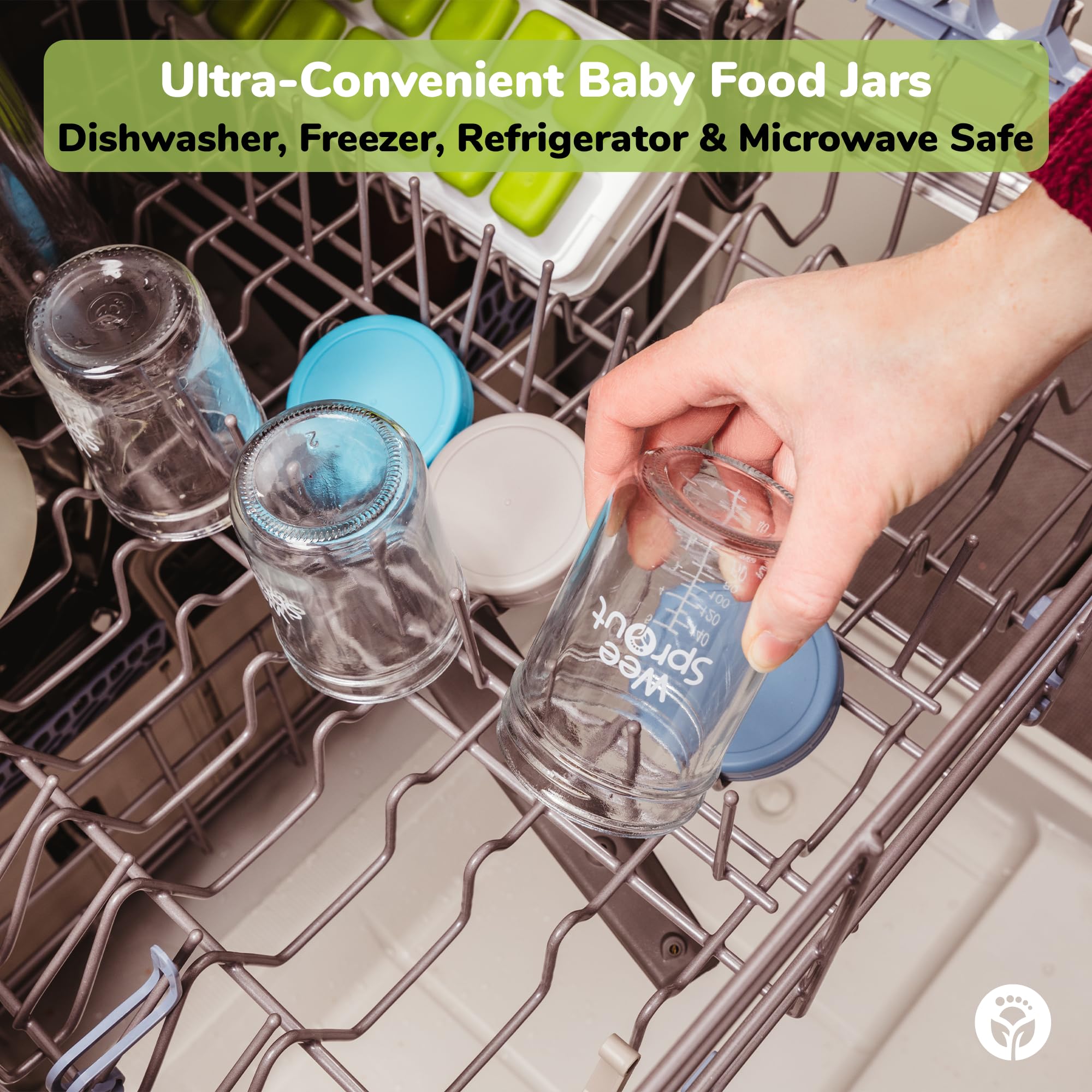 Weesprout Glass Baby Food Storage Jars (4oz, Set of 6): Our glass jars with lids for food are the ultimate solution for safely storing your little one's meals. Made from high-quality food-grade glass and lids that come in multiple colors, these glass baby food jars ensure the purity and freshness of baby food. With a generous 4oz capacity, our infant or baby meal prep container set is perfect for portioning out homemade baby food. The freezer-safe design allows you to prepare and store meals in advance, ensuring a constant supply of nutritious options. Reusable meal prep storage containers eliminate the need for disposable containers and reduce waste. These freezer-safe meal prep containers are microwave-safe for convenient heating. We do not recommend microwaving your glass baby food jar with the lids on it since they are plastic. These infant breastmilk storage containers themselves are microwaveable. Cleaning is a breeze, too, as our breastmilk freezer storage container set is dishwasher-safe. From the early stages of purees to toddler meals, this versatile glass food container set is ideal for every feeding stage. Baby Snack Containers with Plastic Lids Instructions: Let baby food cool before storing - Leave room for expansion when filling your small jars - Avoid going immediately from the freezer to very hot water. Glass Baby Food Storage Containers Storage Tips: Baby food containing poultry, fish, meat, or eggs should stay fresh in the refrigerator for 24 hours and frozen for 3 months. Baby food made with only fruits and vegetables should last 3 days in the refrigerator and 6 months in the freezer. About Us: WeeSprout was founded in 2015 by a husband and wife team in need of healthy, eco-conscious kids' products that wouldnβt break the bank. It all started with our reusable food pouch baby must-haves, and then one good thing led to another.