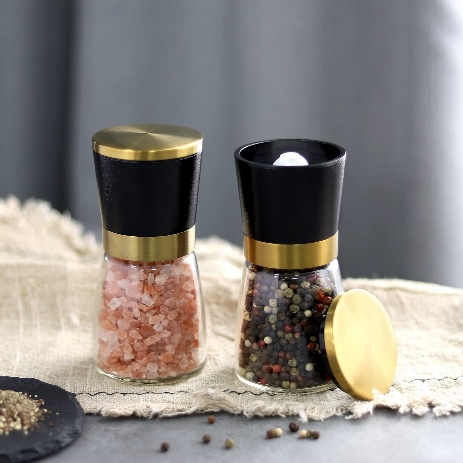 [Broned paiting stainless steel grinder] - Our gold salt and pepper grinder set is made of high quality non-corrosive stainless steel and sodelime glass.It must will be a good addition to your kitchen or table. The golden color grinder lid makes the salt and pepper mill set more noble and exquisite than other style. [Please note:salt and pepper not included.]
