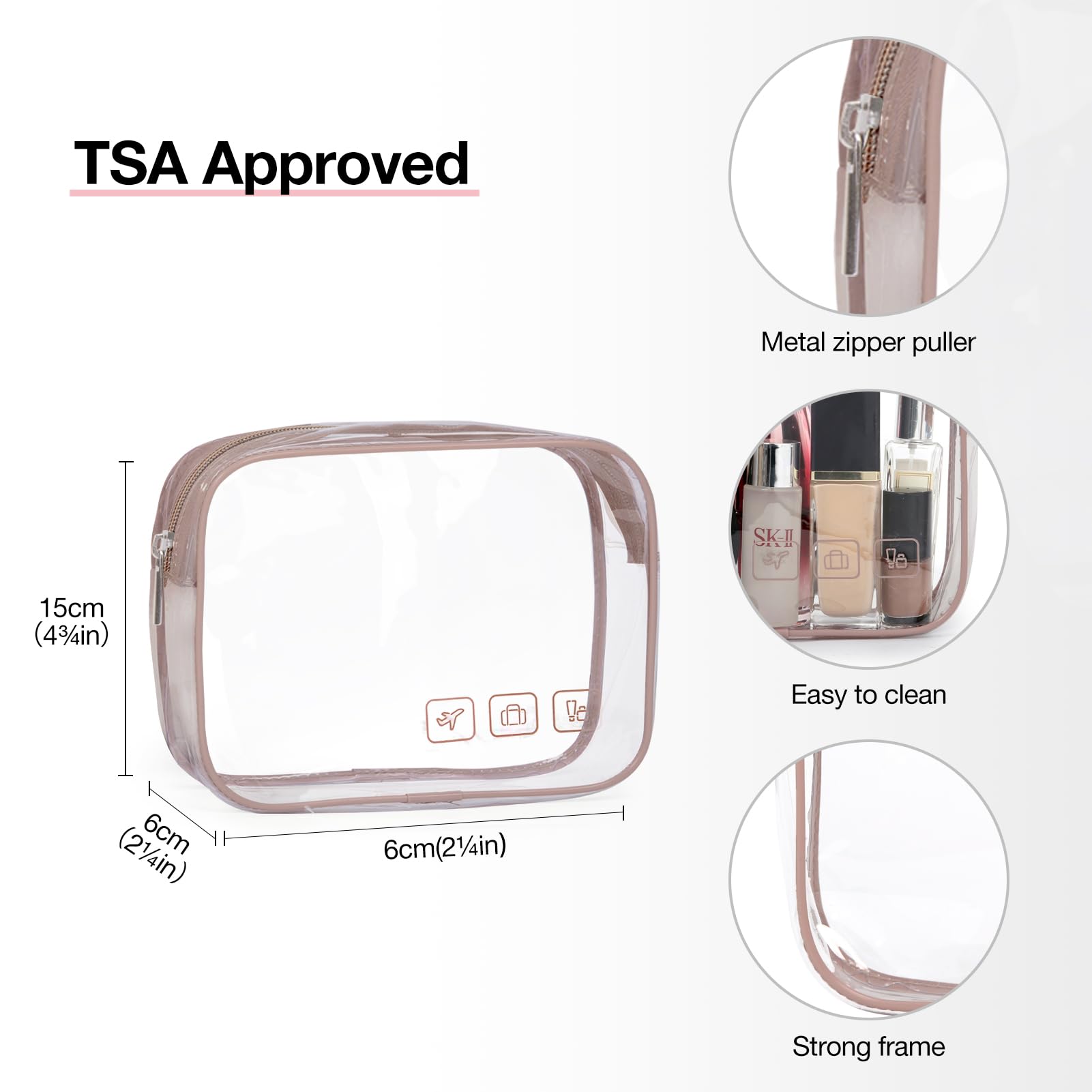 The interior Design: Inner main pockets with elastic straps hold bottles upright; double zipper compartment is for easy access to the items even if not fully opened the bag; transparent sides are for providing clear overview of contents