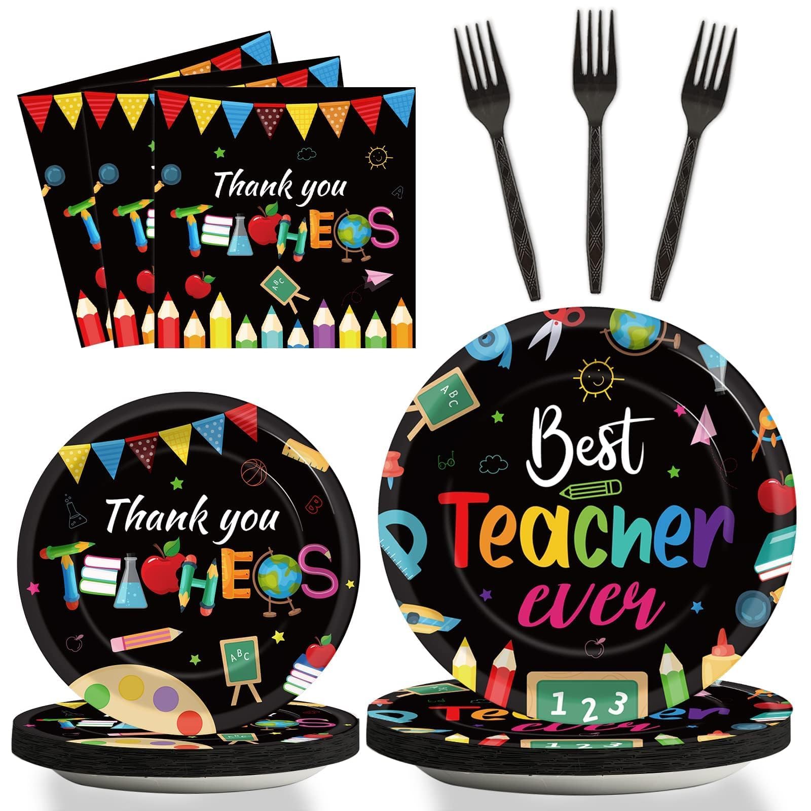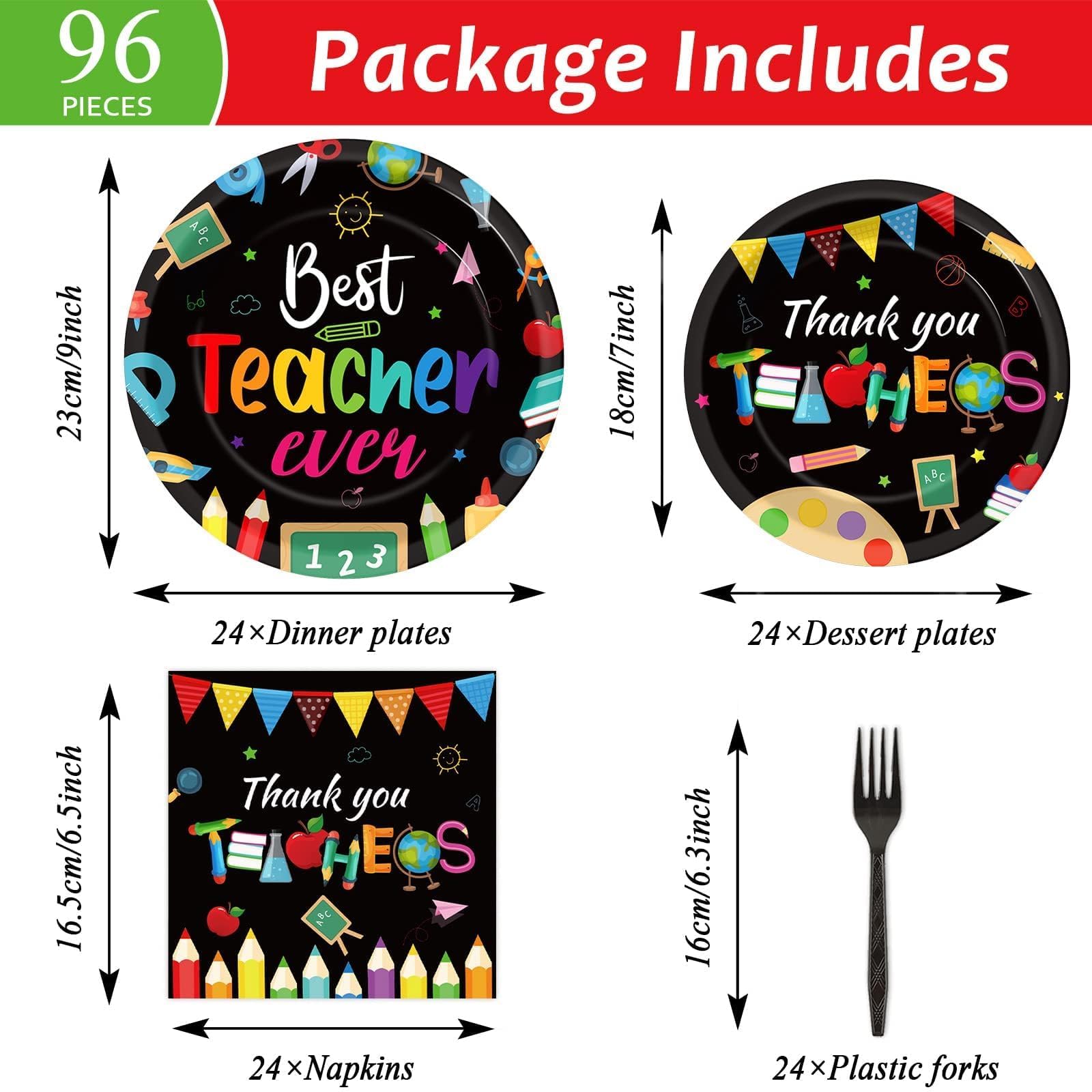 Package included: You will receive 24pcs 7" teacher themed paper plates, 24pcs 7" teacher themed paper plates, 24pcs 6.5" teacher themed napkins, and 24pcs plastic forks, each set can serve 24 guests.