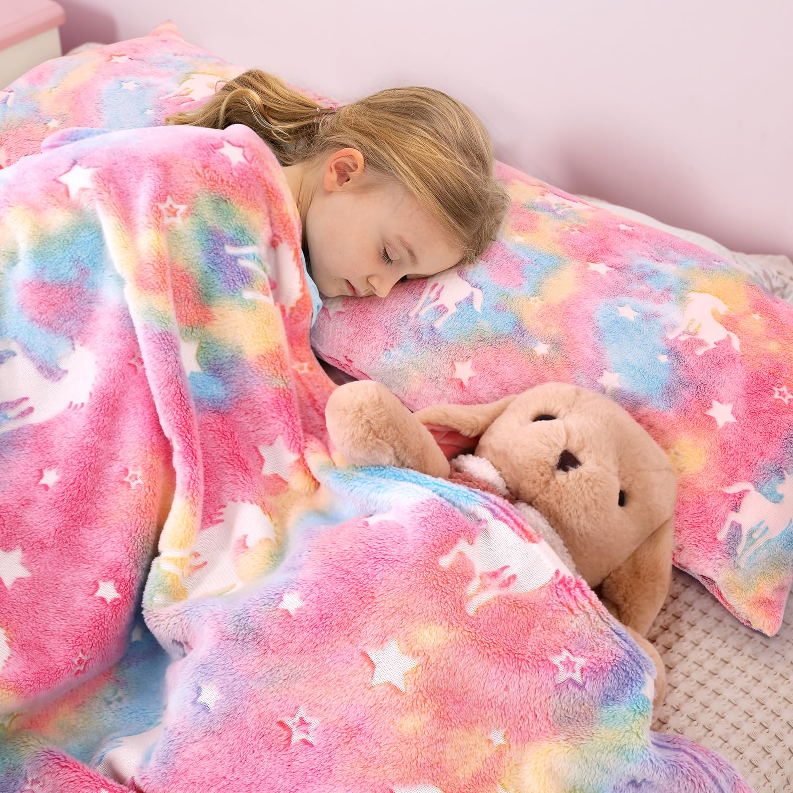 【UNICORNS GIFTS FOR GIRLS】Featuring a bright and colorful unicorns print.The glow in dark throw unicorns long body covers are perfect birthday,New Year,Valentine's day gift for 1 2 3 4 5 6 7 8 9 10 year old kids girls on birthdays, Christmas, Halloween, Easter ,Thanksgiving ,Children’s Day and other occasions.