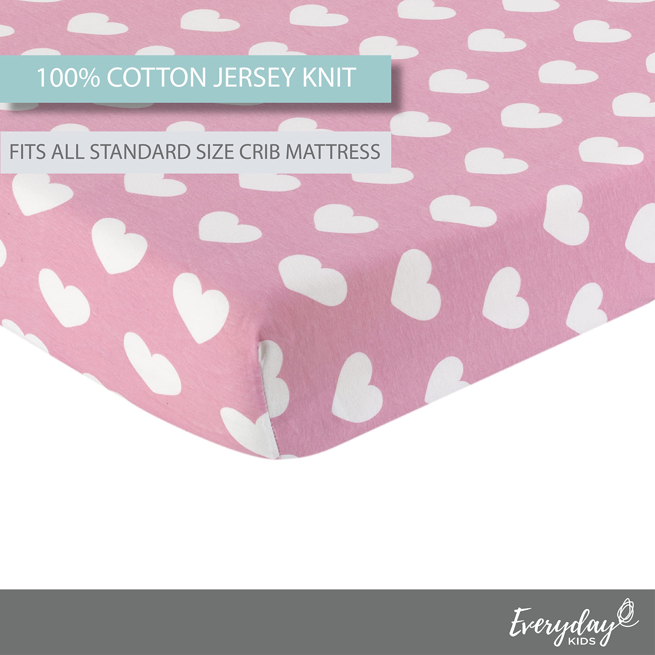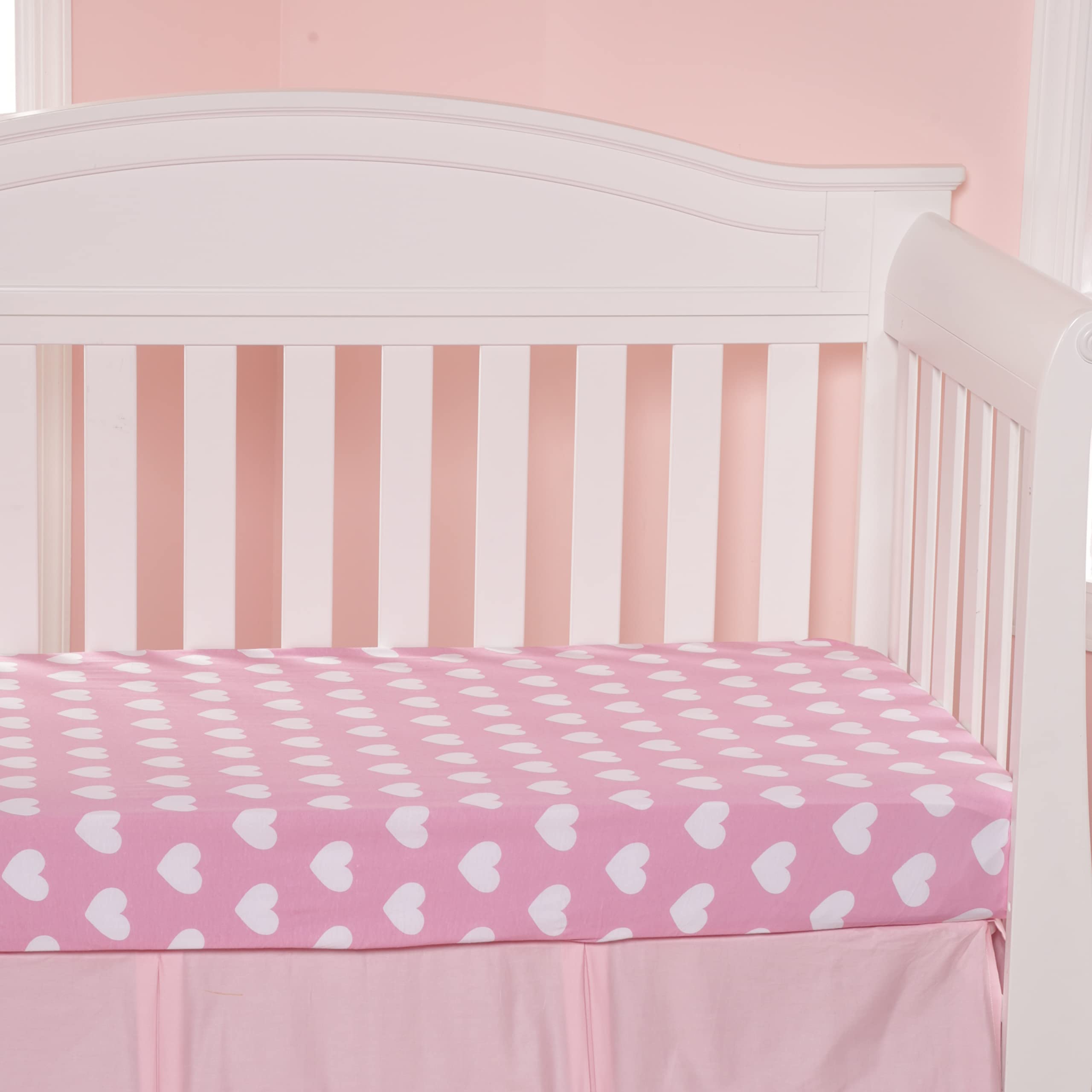 ENTERTAINING FOR BABIES AND TODDLERS: In unique and playful designs, the first sheet features white hearts on a pastel pink sheet and the second is a heather gray background with white polka dot patterns!